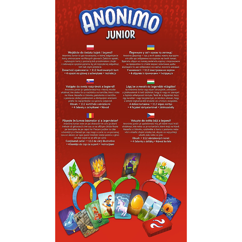 Paseste in lumea basmelor si a legendelor! Anonimo Junior este un joc distractiv in care jucatorii trebuie sa ghiceasca cine sau ce se afla pe cartile fixate pe bentitele de pe capul lor. Fiecare jucator ia cate o bentita si o fixeaza pe cap, trage o carte cu un personaj sau un obiect, iar apoi pune intrebari istete pentru a ghici cat mai rapid ce se afla pe carte.