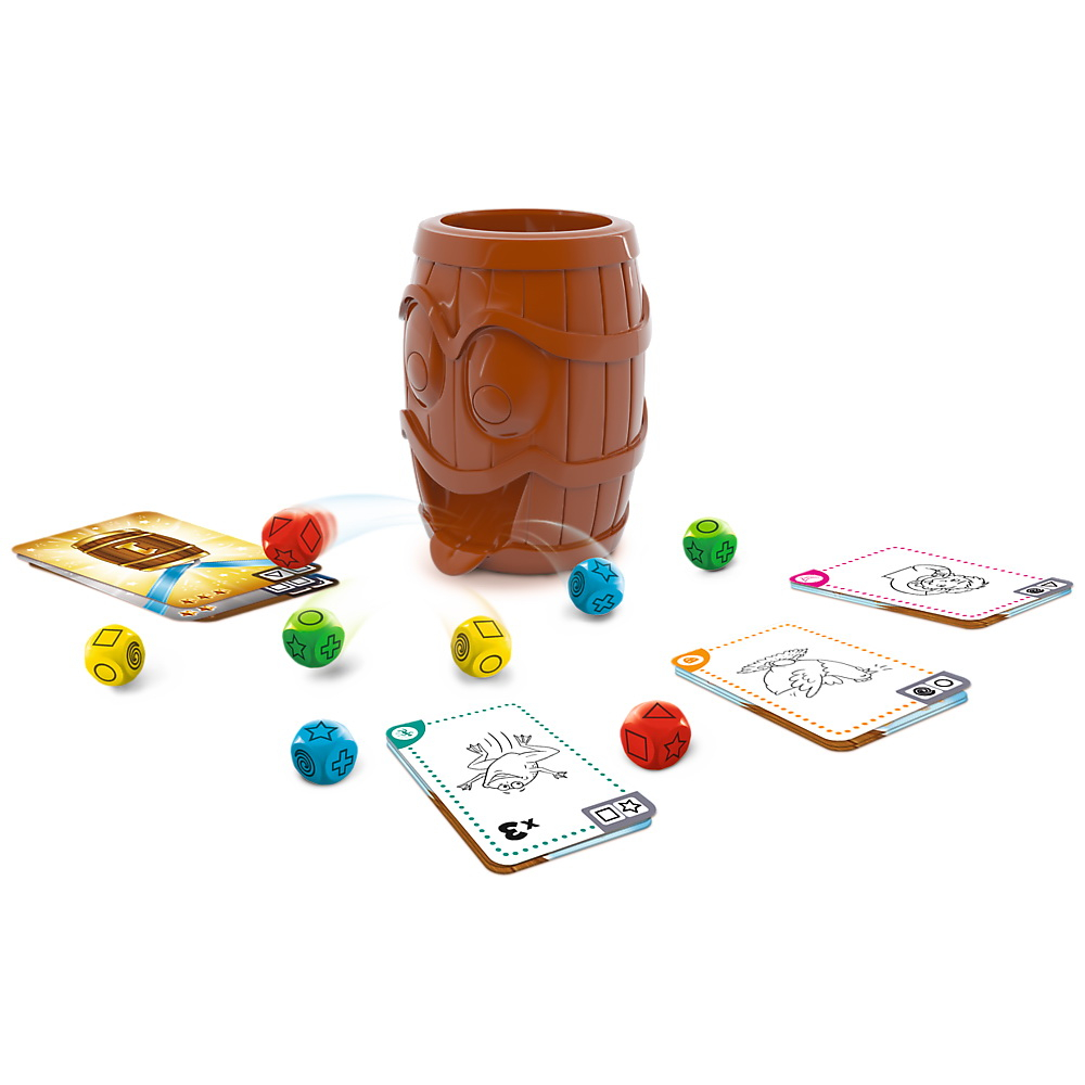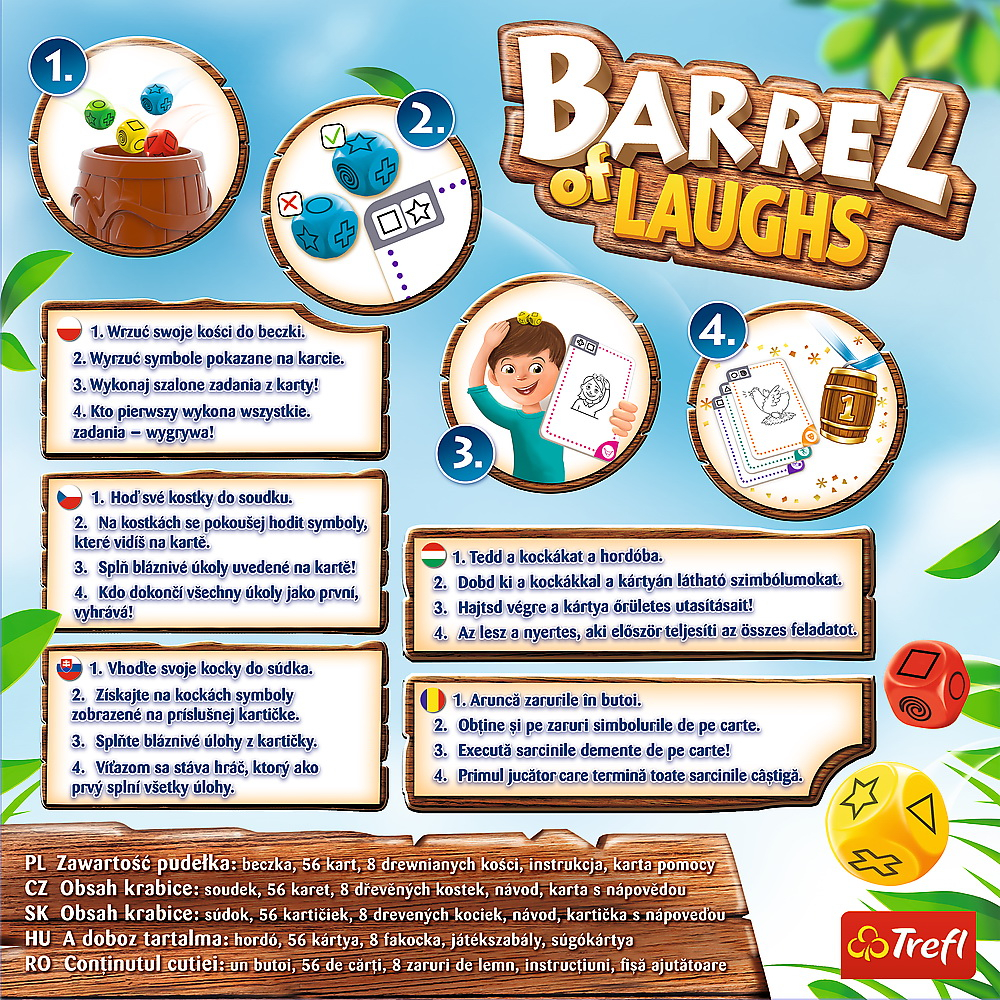 Barrel of Laughs este un joc de familie extrem de bun, in care toata lumea trebuie sa-si indeplineasca sarcinile salbatice din cartile lor. Imitati o gaina sau o locomotiva cu aburi, bate ritmul cu pantofii pe masa, cautati ceva rosu, alergati inapoi in jurul mesei - acestea sunt doar cateva dintre sarcinile care garanteaza distractie! Arunca zarurile in butoi, finalizeaza sarcina cat de repede poti si intra in ring pentru varful podiumului! Continutul cutiei: butoi 8 cuburi de lemn 53 de carti de activitate 3 carti de podium regulile jocului card de ajutor. Recomandat pentru varsta peste 5 ani. Scopul jocului: Scopul este de a finaliza sarcinile afisate pe carti cat mai repede posibil si de a obtine cea mai buna clasare posibila. Cum se joaca: 1. Întoarceti cartea de sarcina. 2. Aruncati zarurile si aruncati simbolurile de pe card. 3. Efectuati sarcina pe card. 4. Odata ce ai finalizat toate cele 3 sarcini, poti lupta pentru podium. 5. Jucatorul care poate obtine cartea podiumului de locul 1 va fi castigatorul jocului.
