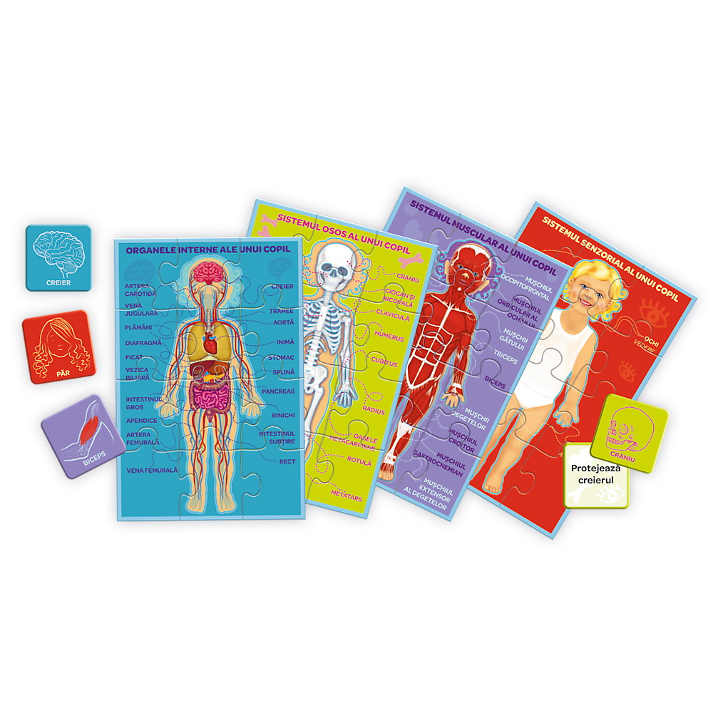 Jocul Corpul meu este un joc simplu pentru prescolari care ii introduce pe copii in structura corpului uman. În timpul jocului, copiii invata nu numai numele partilor corpului, ci si organele interne, oasele si muschii. Este o sursa de cunostinte despre corpul uman, perfect adaptata varstei copilului. Include: 4 table de puzzle, 24 de piese, instructiuni cu multe sugestii pentru joc. Jocul poate fi jucat in minim 3 persoane si maxim 5 persoane.