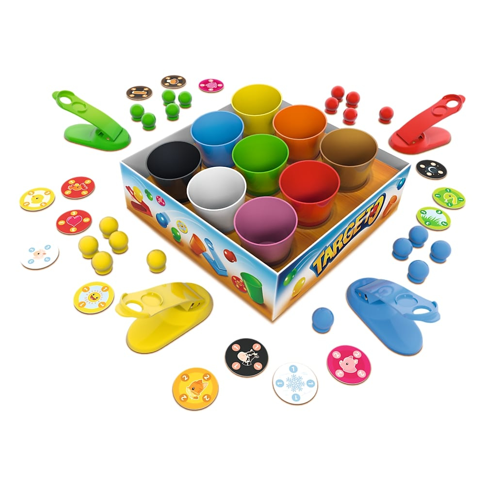 Loviti jocul de masa Targeto Încercati cat de bine puteti tinti! Alegeti catapulta, pionul si incepeti cu unul dintre cele 5 jocuri grozave. Încercati sa va amintiti culorile cupelor, creati amprente animale, alergati dupa puncte sau incercati sa va aliniati pionii in ordinea corecta. Continutul pachetului: 9 cani, 20 de figuri, 4 catapulte, 27 jetoane, instructiuni. Dimensiunile ambalajului 26 × 26 × 8 cm. Potrivit pentru copii de la 5 ani.