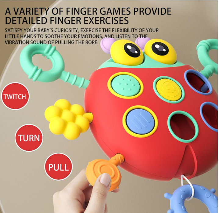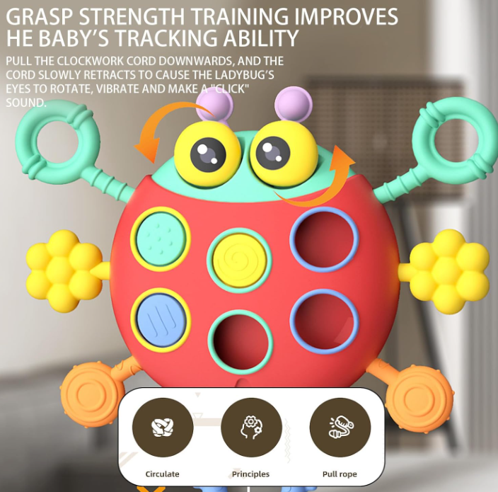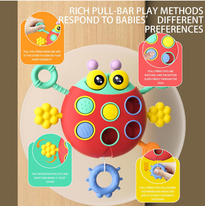 Jucăria noastră montessori cu sfoară de tragere are o gamă largă de activități, cum ar fi tragerea, apăsarea și răsucirea, ceea ce o face o jucărie multifuncțională. Forma sa drăguță de gărgăriță se adaugă la atractivitatea sa, făcându-l perfect pentru copiii cu vârsta cuprinsă între 6 și 18 luni pentru a-și dezvolta abilitățile motorii fine.