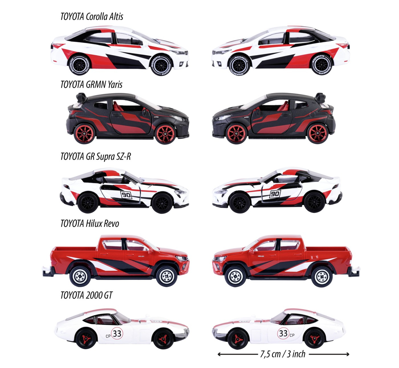 Majorette - Masini de jucarie Toyota Racing (set cadou cu 5 masini) - masini din metalice cu roata libera si suspensie, fiecare 7,5 cm, Setul de masini de jucarie Majorette contine 5 modele Toyota diferite: 1. Toyota 2000 GT, 2. Toyota Hilux Revo, 3. Toyota GR Supra SZ-R, 4. Toyota Corolla Altis, 5. Toyota GRMN Yaris.