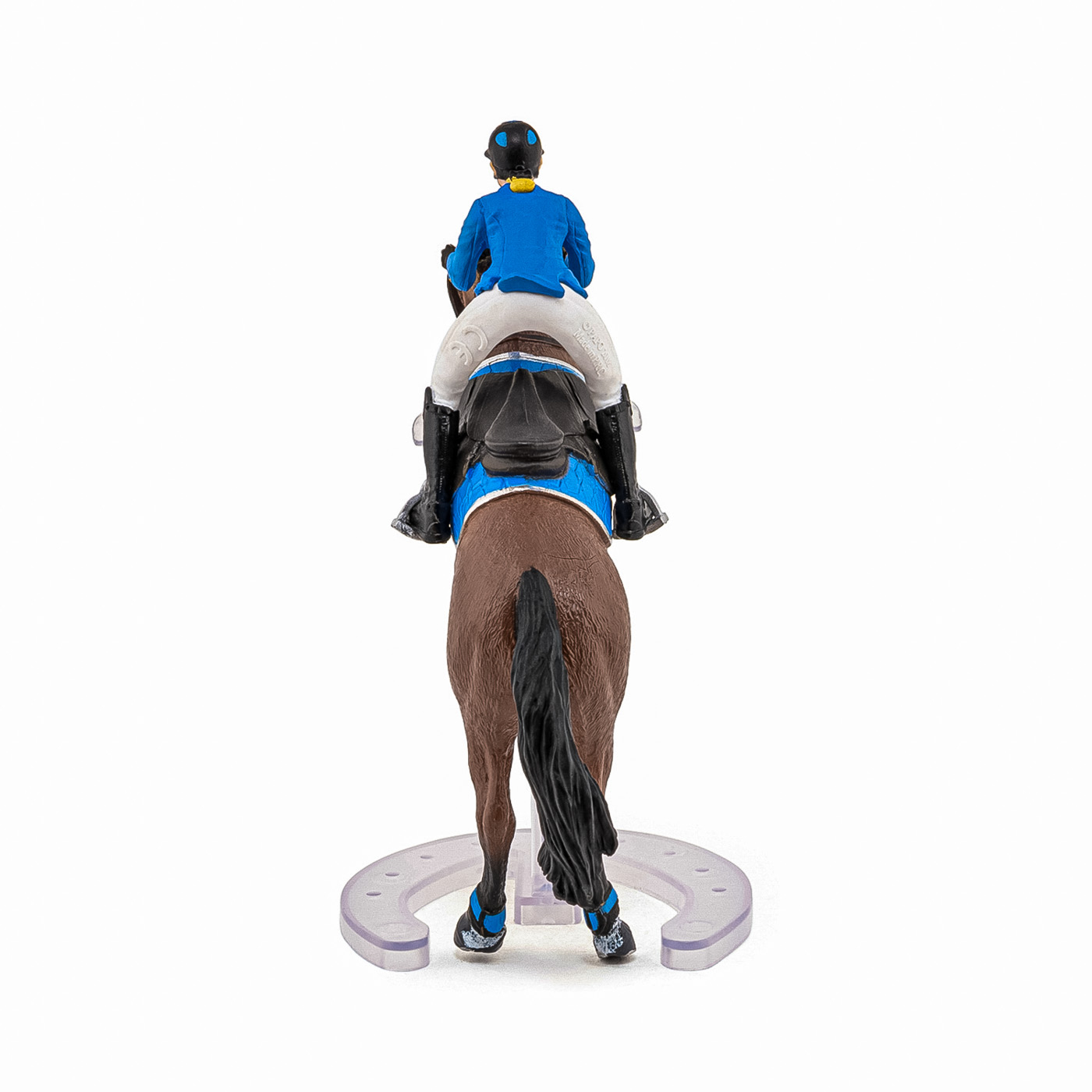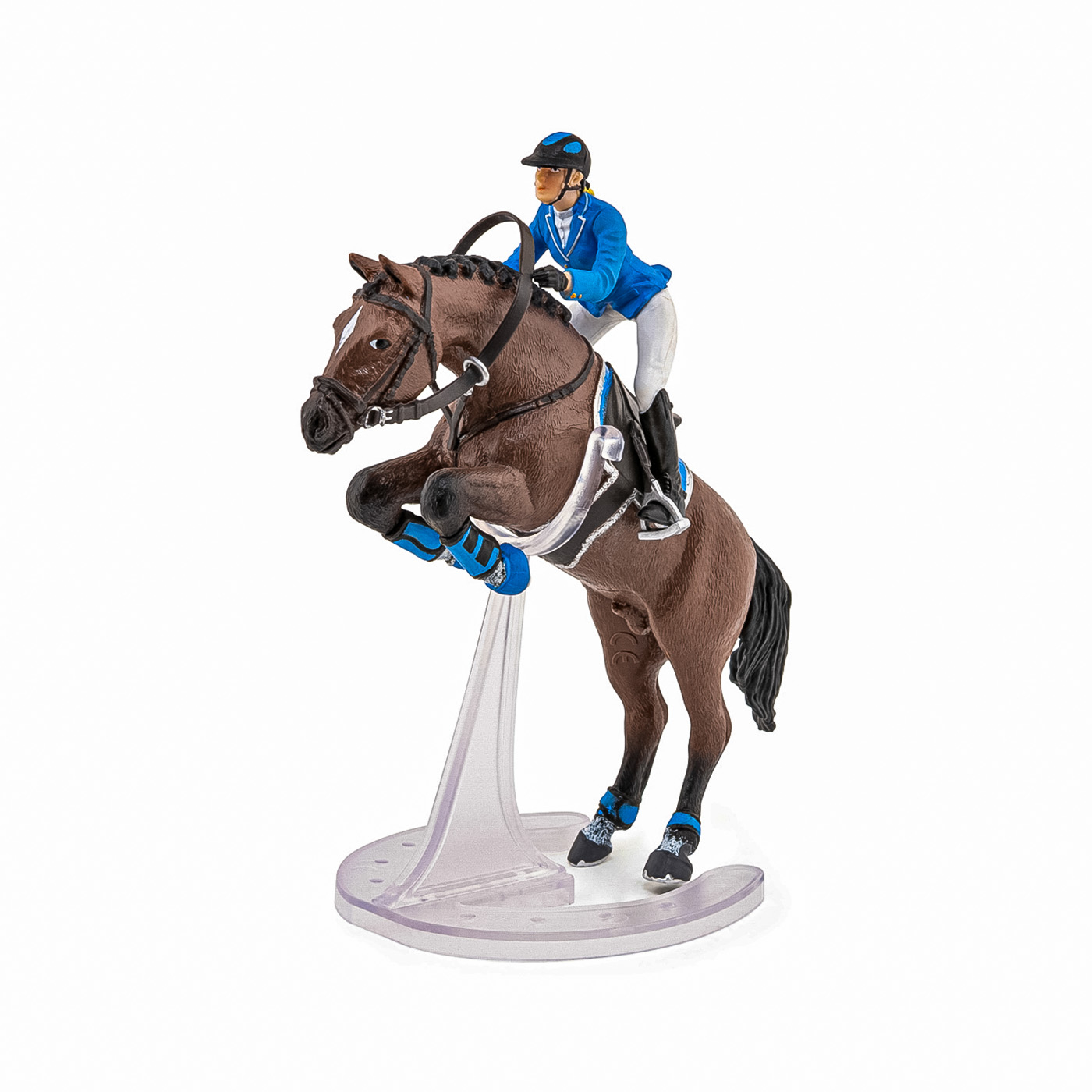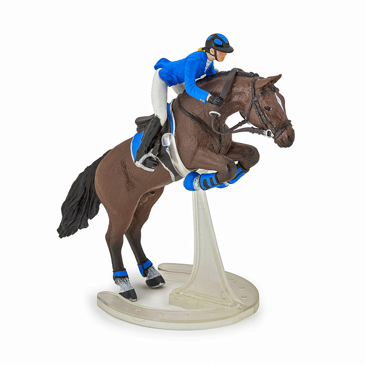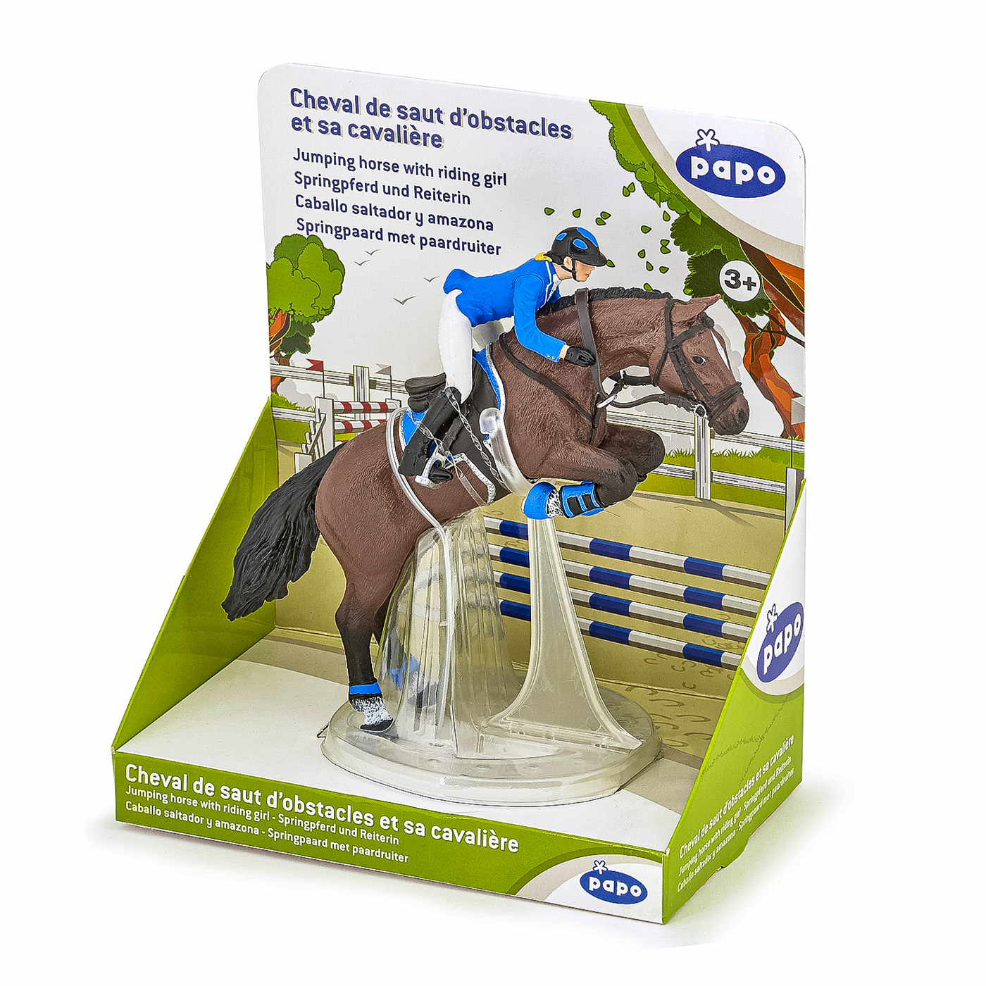 Faceti o plimbare prin campuri cu ecvinele Papo, participati la concursuri de sarituri sau chiar la cursuri de dresaj. Tensiunea este la maxim pe traseul de sarituri, tanara calaret insotita de calul ei se pregateste sa treaca de ultimul obstacol care ii desparte de victorie. Regula este simpla, pentru a castiga este necesar ca impreuna sa o treaca fara sa o rastoarne. Produsul are urmatoarele dimensiuni: 10 x 16 x 19cm si este recomandat copiilor cu varsta peste 3 ani. De mai bine de 20 de ani, Papo inoveaza constant si ii face pe copii din intreaga lume sa viseze cu o gama bogata de peste 600 de produse, reprezentand 12 lumi, animale si personaje. De la modelul original la serie, fiecare dintre figurinele Papo a fost conceputa si creata in Franta pentru a fi fabricata intr-o permanenta preocupare pentru calitate. Pictate manual, atentia la detalii este acum recunoscuta. Figurinele Papo se disting prin acuratete si realism, detaliile sunt de asa natura incat am putea crede ca se vor pune in miscare.