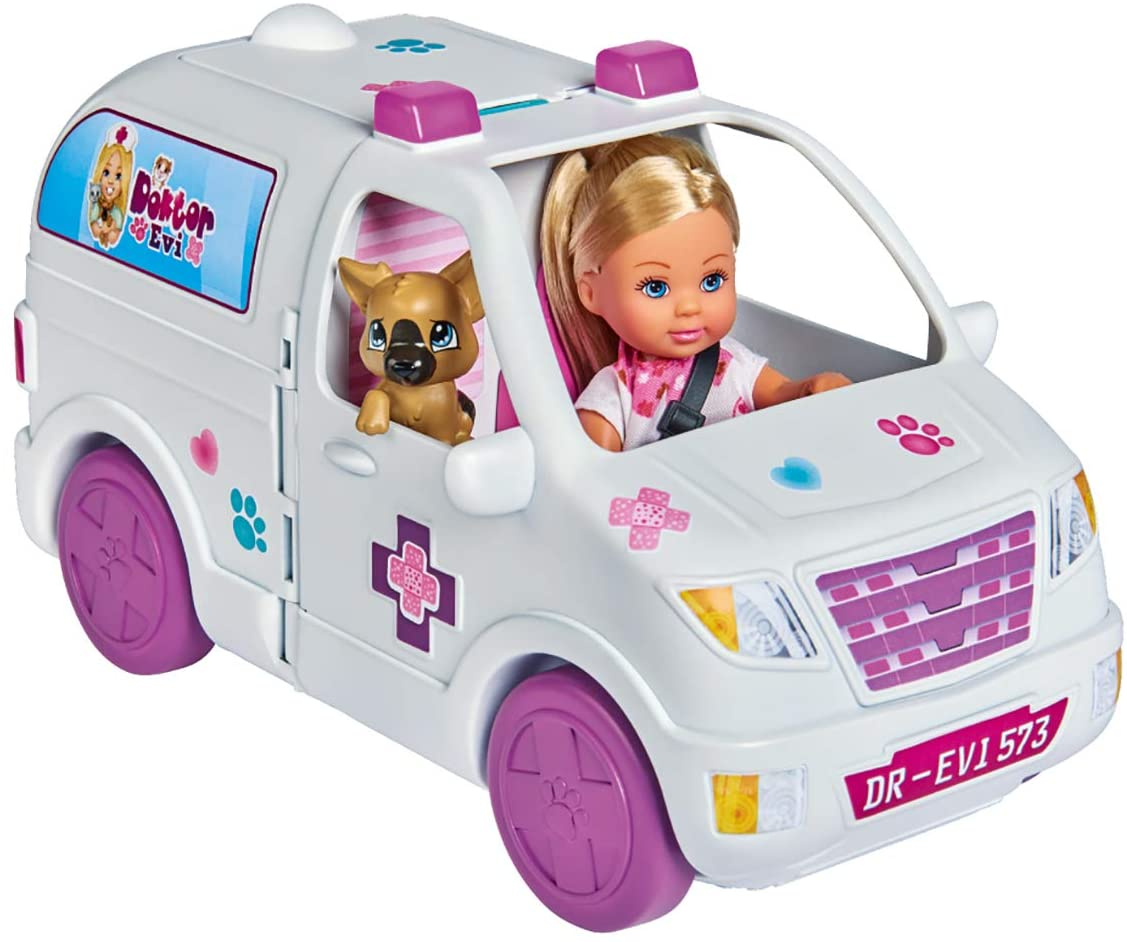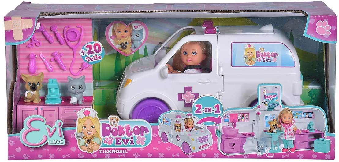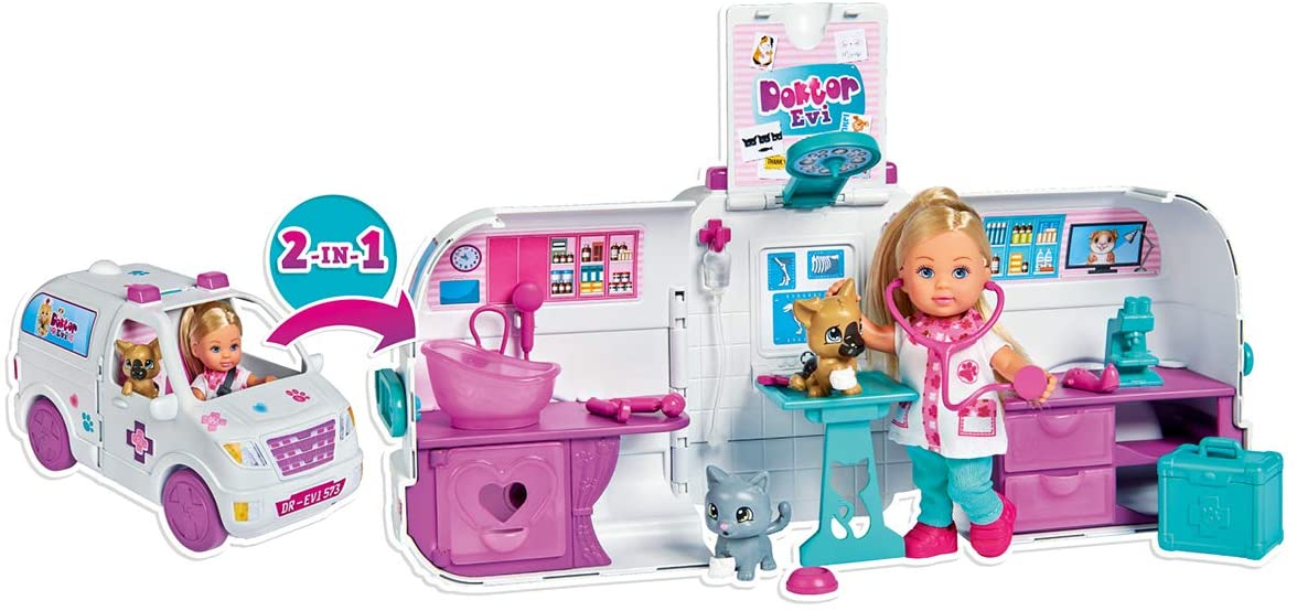Ca medic veterinar, doctorul Evi este de serviciu in orice moment si ajuta animalele care au nevoie. Cand lucreaza in exterior, Evi este afara cu mobilul sau alb 2-in-1 pentru animale, care poate fi transformat intr-o clinica veterinara perfect echipata prin deschiderea acestuia. Pe masa de tratament, isi poate examina pacientii cu stetoscopul sau poate efectua o ecografie. În mobilul sau pentru animale, ea a amenajat, de asemenea, o statie pentru spalarea animalelor si o statie de lucru cu un microscop. Doctorul Evi are la dispozitie pacienti un caine si o pisica, pe care Evi le poate examina in detaliu cu suficiente accesorii. În functie de diagnostic, pacientului dulce i se administreaza un bandaj, o infuzie, oxigen, o seringa sau chiar un guler de gat. Setul de jocuri pentru animale Doctor Evi 2-in-1 de la Simba Toys contine un mobil pentru animale, o papusa Evi Love complet articulata intr-o tinuta de doctor si numeroase alte accesorii care pot fi depozitate convenabil in interiorul mobilului pentru animale.
