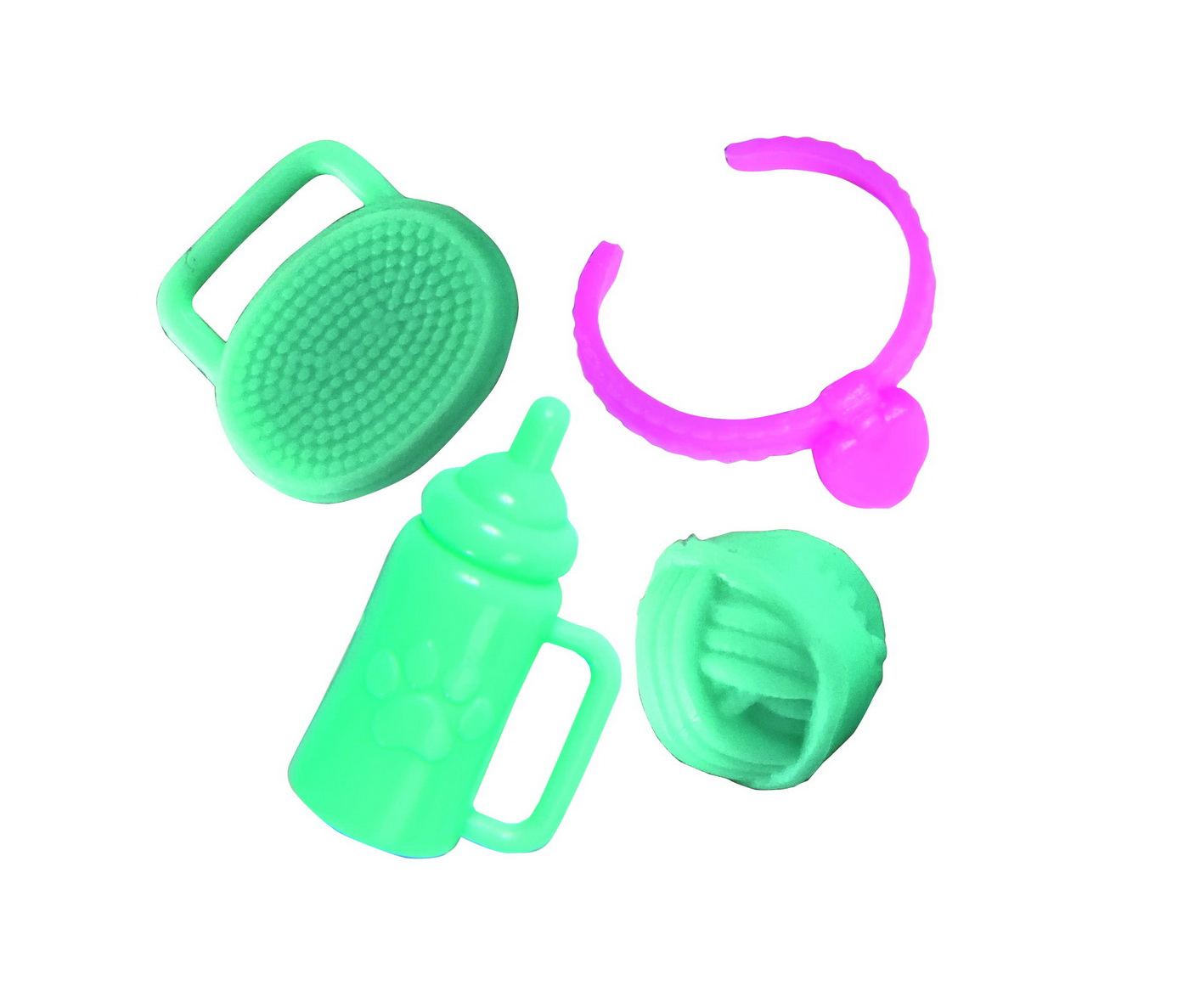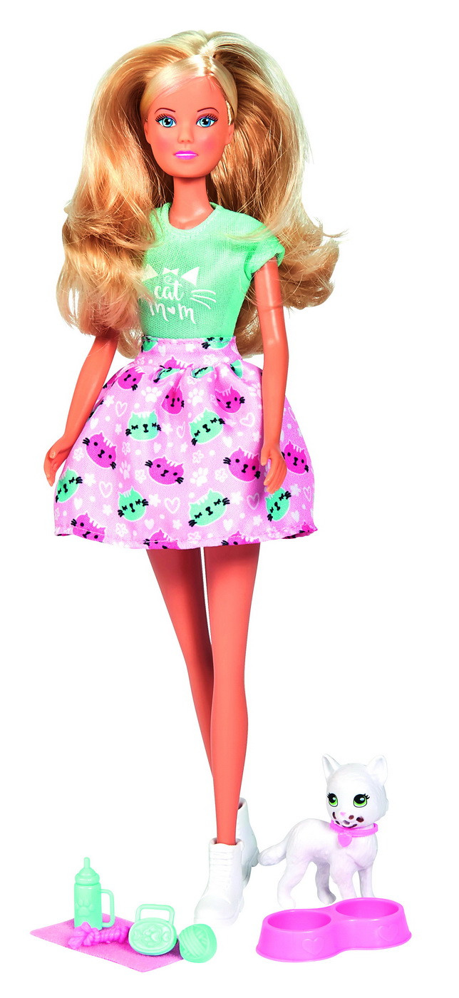 Steffi poarta o rochie la moda, si pleaca la plimbare impreuna cu pisicuta ei, plus multe accesorii, Inaltime papusa 29cm. Papusa Steffi are grija de pisicuta. Poarta o rochie verde si roz, cu pisici si pantofi albi. Pisicuta este alba si are fata murdara. Este suficient sa umeziti carpa atasata setului cu apa calda si sa stergeti gura, iar murdaria va disparea. Accesoriile pentru ingrijirea unui animal de companie includ: un castron pentru mancare si apa, o minge de lana, o sticla.