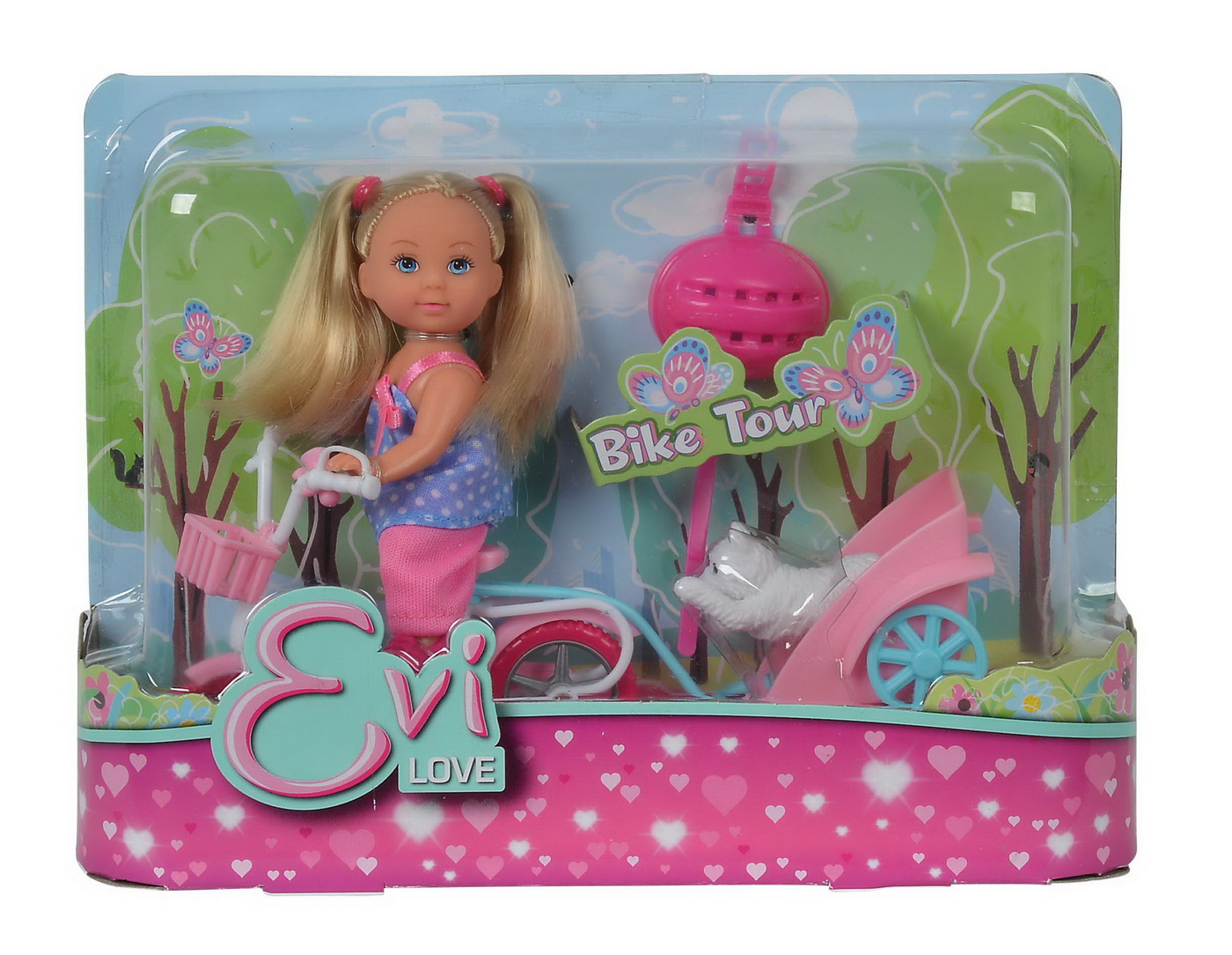 Simpatica Evi iese la plimbare cu bicicleta ei echipata cu trailer. In trailer micuta Evi isi poate transporta catelul preferat. Papusica este imbracata intr-o pereche de pantaloni roz si o bluzita albastra cu bretele roz.Inaltimea papusii este de aproximativ 12 cm. Cine a spus ca nu trebuie sa fii la moda chiar si cand mergi pe bicicleta? Evi stie cat de importante sunt plimbarile si abia asteapta sa profite de vremea frumoasa pentru a-si scoate catelusul la plimbare. E perfecta pentru fetita ta!
