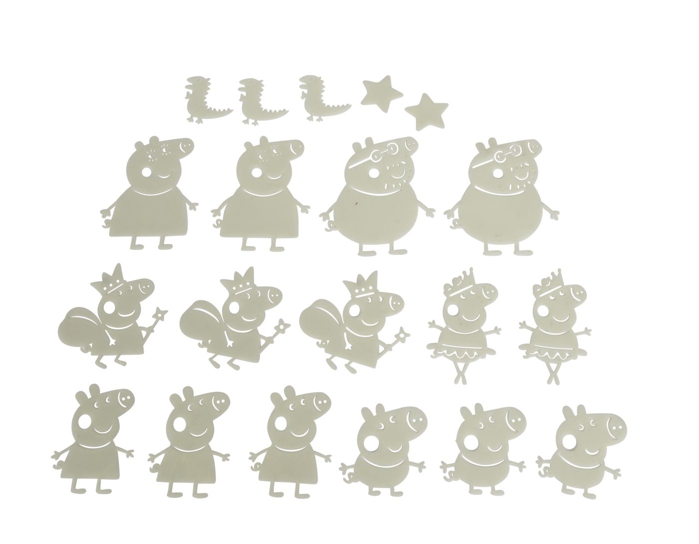 Setul Purcelusa Peppa care lumineaza in intuneric este completarea perfecta pentru colectia micilor fani ai seriei si este ideal pentru decorarea si linistirea camerei copilului. Motivele includ intreaga familie Purcelusa: Mama Purcelusa, Papa Purcelusa, Peppa in rol de balerina, printesa si in rochie, precum si fratele ei mai mic, George. Setul contine in total 20 de piese, cu inaltimi cuprinse intre 2,5 si 7 cm. Elementele luminoase se incarca ziua prin lumina naturala sau artificiala si devin puncte de atractie stralucitoare noaptea. Pentru un efect mai intens, piesele pot fi expuse sub o sursa directa de lumina. Formele se ataseaza usor pe perete sau tavan cu ajutorul benzilor adezive incluse. Motivele care stralucesc in intuneric creeaza o atmosfera placuta si relaxanta in camera, facilitand adormirea si reducand teama de intuneric a copiilor.