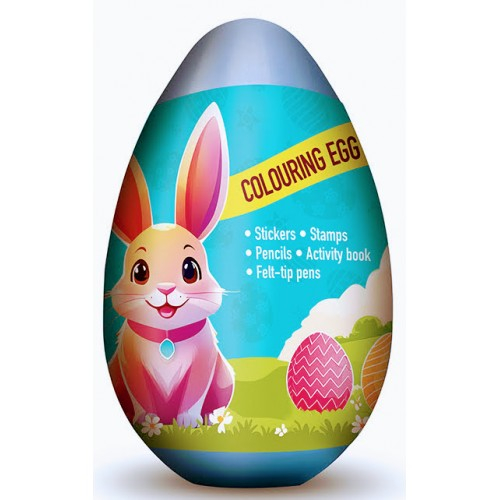 CONTINUT - 2 STAMPILE REALIZATE DIN LEMN NETRATAT SI CAUCIUC NATURAL, NON TOXICE ( 4.5X4.5X1.8 CM ), 1 TUSIERA ( 8.5X5.7X1.3 CM ) CU TUS ALBASTRU PE BAZA DE GLICERINA,LAVABIL, 3 CARIOCI GIOTTO TURBO COLOR, LAVABILE, CU CAPAC ANTI-SUFOCARE, 3 CREIOANE COLORATE, 1 CARTE DE ACTIVITATI, 30 STIKERE, 1 CUTIE DIN PLASTIC IN FORMA DE OU. DIMENSIUNI: INALTIME: 16 CM, DIAMETRU: 10 CM.