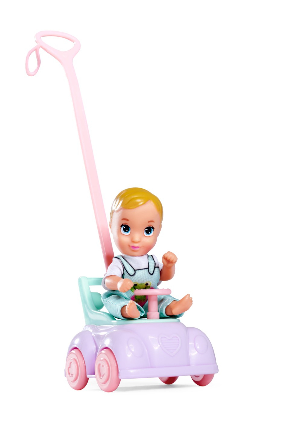 Steffi pleaca la plimbare cu bebelusul ei si cu masinuta premegator a acestuia. Pe langa papusa fashion de 29 cm, sunt incluse 12 accesorii, inclusiv o geanta de mana Steffi roz, si diverse accesorii pentru bebelus.