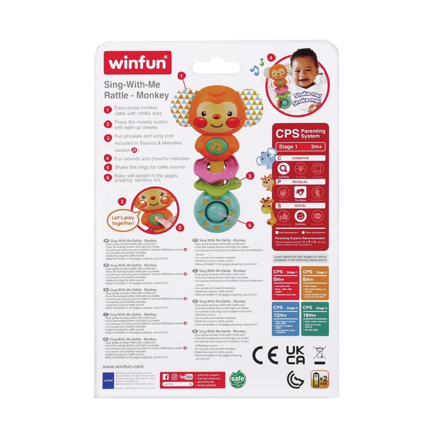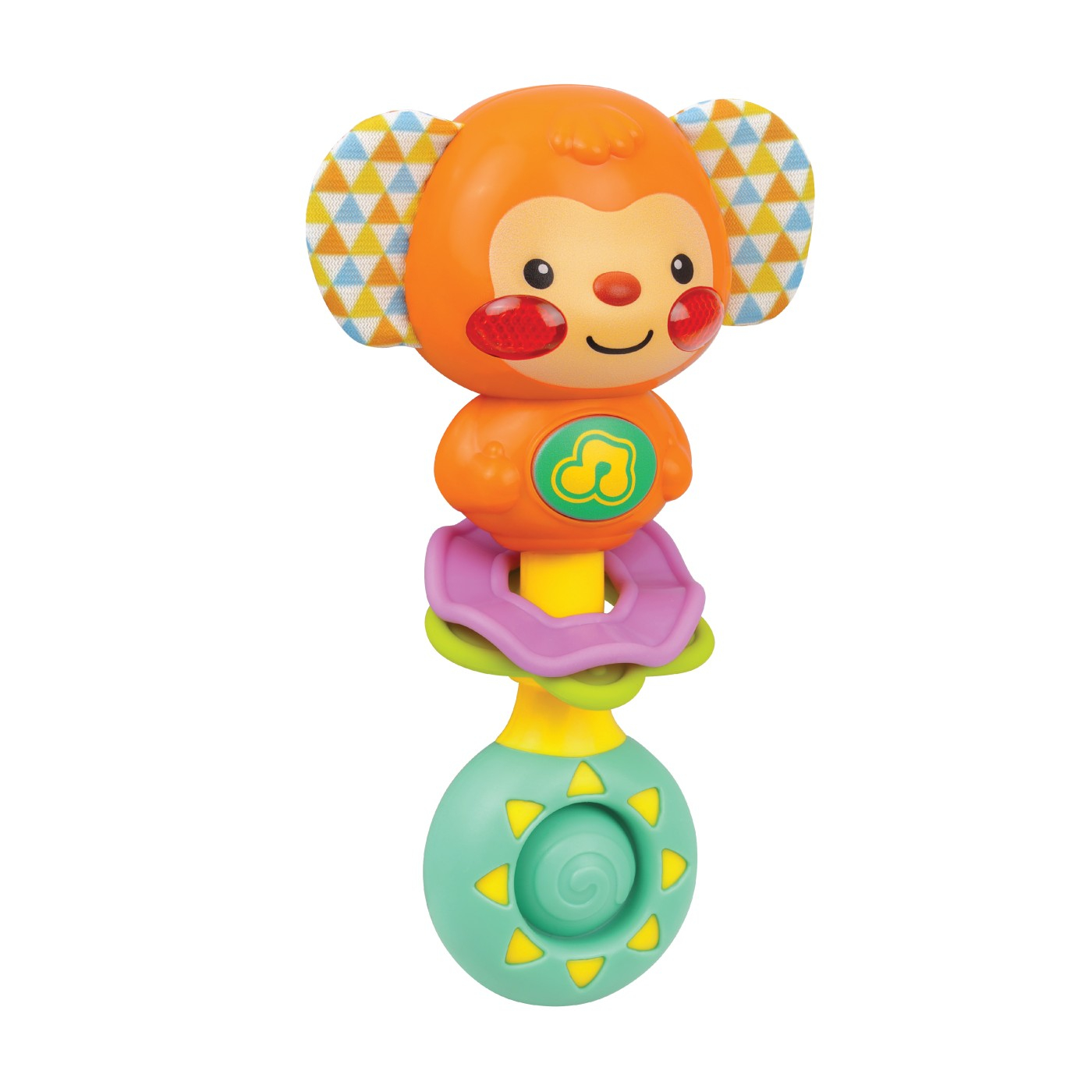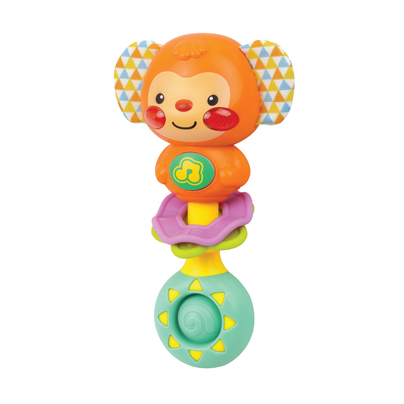 Zornaitoare Maimutica: Distractie Senzoriala pentru Bebelusi de la 0 Luni + Zornaitoarea maimutica este jucaria perfecta pentru bebelusi incepand de la varsta de 0 luni, fiind conceputa pentru a stimula dezvoltarea senzoriala si abilitatile motorii fine. Usor de prins, cu un design ergonomic, aceasta jucarie are urechi incretite care ofera o textura interesanta pentru explorare tactila. Apasand butonul melodie, obrajii maimutei se lumineaza intr-o combinatie fascinanta de culori, captand atentia bebelusului si stimulandu-i simturile vizuale. Pe langa lumini, jucaria emite sunete si fraze distractive, precum si cantece si melodii care va vor amuza si incanta micutul. Aceste sunete sunt perfecte pentru a dezvolta perceptia auditiva si pentru a introduce bebelusul in lumea muzicii si a sunetelor. Zornaitoarea este echipata cu inele care, atunci cand sunt scuturate, produc sunete ce incurajeaza interactiunea activa, ajutand la dezvoltarea coordonarii mana-ochi si a intelegerii relatiilor cauza-efect. Compacta si usor de transportat, zornaitoarea maimutica este ideala pentru a fi luata oriunde, asigurand ca bebelusul tau va avea mereu la indemana un companion de joaca.