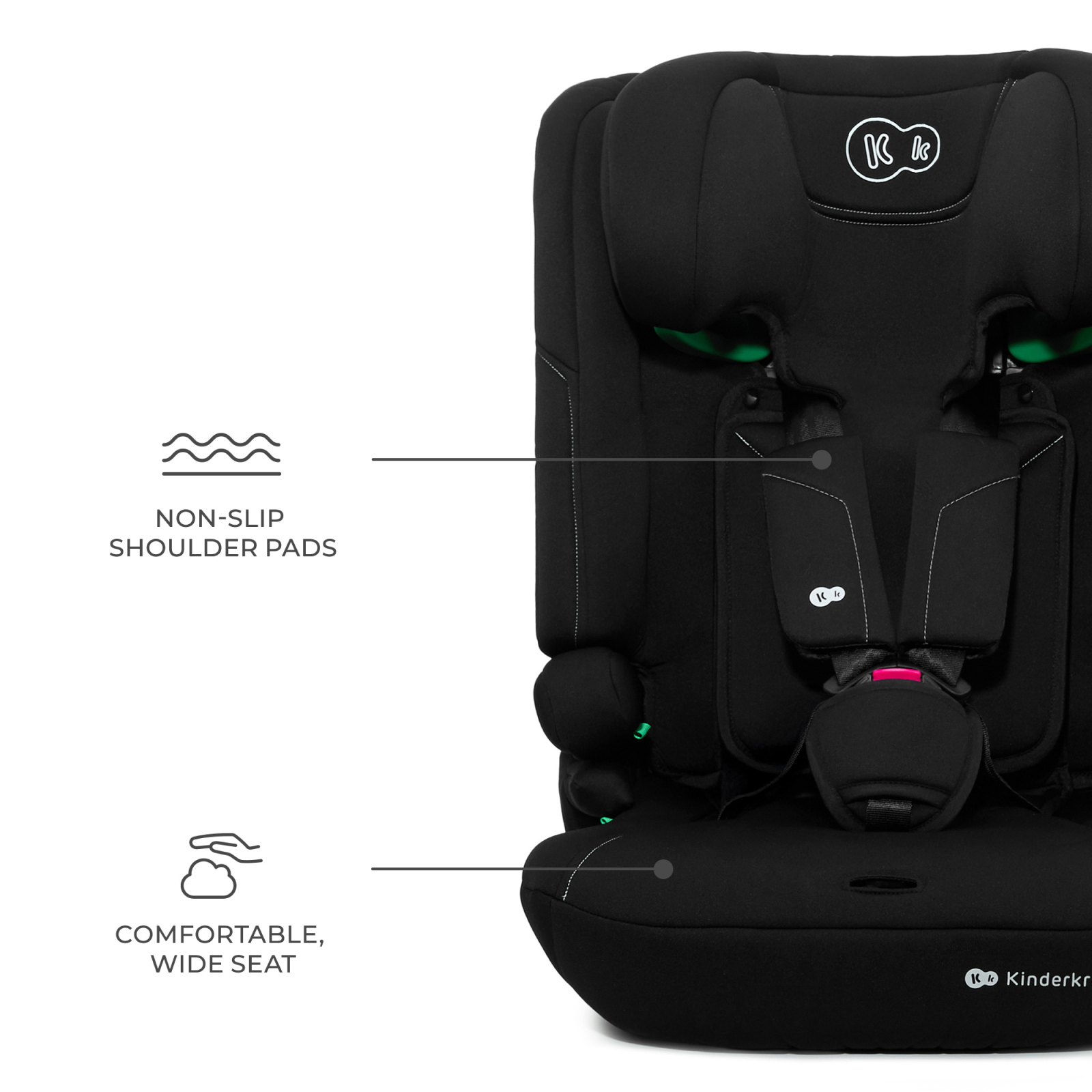 Scaun auto 3-in-1 Kinderkraft I-COMFY I-Size 76–150 cm BLACK H-GUARD SYSTEM, SPS, EASY GROW Kinderkraft I-COMFY BLACK este un scaun auto 3-in-1 conceput pentru a creste odata cu copilul dumneavoastra – potrivit pentru copii cu inaltimea intre 76 si 150 cm (aproximativ 15 luni – 12 ani). Respecta standardul strict ECE R129 i-Size, care include si teste de impact lateral, oferind siguranta sporita la fiecare etapa de dezvoltare. Datorita sistemului EASY GROW, reglarea tetierei si a centurilor se realizeaza simultan, permitand ajustarea rapida a scaunului in functie de inaltimea copilului. Tetiera H-GUARD cu 3 straturi de protectie si spuma, impreuna cu sistemul SPS, ofera o protectie excelenta in caz de impact lateral. Scaunul Kinderkraft I-COMFY BLACK se instaleaza usor si universal, folosind centura de siguranta a masinii, ceea ce permite montarea lui in aproape orice tip de vehicul. Ghidajul unic pentru centura pelviana asigura pozitionarea corecta si stabila a acesteia, mentinand-o jos, pe soldul copilului – aspect esential pentru siguranta in timpul calatoriei. Kinderkraft I-COMFY BLACK dispune de 10 trepte de reglare a spatarului, pentru adaptare optima la inclinarea banchetei. sezutul este larg si confortabil, prevazut cu centuri de siguranta in 5 puncte, cu pernute moi si strat antiderapant pe protectiile pentru umeri. De la o inaltime de 140 cm, scaunul poate fi utilizat si ca inaltator (booster). Caracteristici principale ale produsului: Kinderkraft I-COMFY BLACK este conform standardului ECE R129 i-Size Sistem EASY GROW – reglare simultana a tetierei si a centurilor Sistem H-GUARD – tetiera cu 3 straturi de protectie si spuma SPS – protectie laterala intarita Ghidaj unic pentru centura pelviana – pozitionare stabila si corecta 10 trepte de reglare a spatarului sezut larg si confortabil, centuri in 5 puncte cu pernute moi si strat antiderapant Poate fi folosit ca inaltator – pentru copii intre 140–150 cm Specificatii tehnice: Lungimea interioara a sezutului: 30 cm Lungimea exterioara a sezutului: 39 cm Latimea sezutului (exterioara): 44 cm Latimea sezutului (interioara): 35 cm Latimea totala exterioara: 50 cm Înaltimea interioara minima: 52 cm Înaltimea interioara maxima: 75 cm Înaltimea exterioara minima: 55 cm Înaltimea exterioara maxima: 80 cm Latimea spatarului (interioara): 33 cm Latimea spatarului (exterioara): 44 cm Latimea tetierei (exterioara): 17 cm Latimea tetierei (interioara): 36 cm