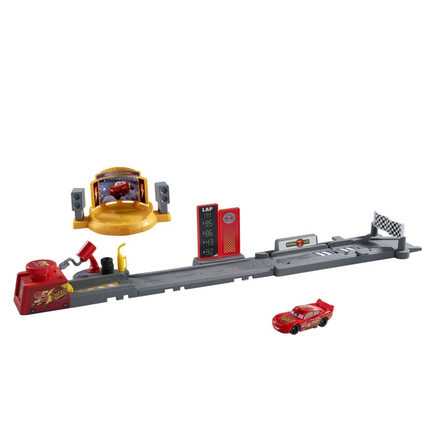 Setul de joaca Disney Pixar Cars pista de lansare are doua moduri de joc, astfel incat sa poti demonstra abilitatile de curse si cascadorii ale lui Fulger McQueen. Setul de joaca include detalii de impingere a masinilor, cum ar fi o zona de tuning cu accesorii detasabile, pentru a inspira povesti creative centrate pe personaje familiare. Plaseaza masinuta de jucarie Fulger McQueen inclusa in lansator si trimite-o in viteza pe pista si printre steagurile in carouri, facandu-le sa se roteasca, urmareste pe ecranul mare! Pentru a-si etala abilitatile de cascador, ridica rampa din mijlocul pistei de curse. Lanseaza-l pe Fulger McQueen si arunca-l peste steagul in carouri, aterizand in cercul castigatorilor. Variaza provocarea mutand cercul castigatorilor mai aproape sau mai departe. Are pilotul vedeta suficienta experienta?