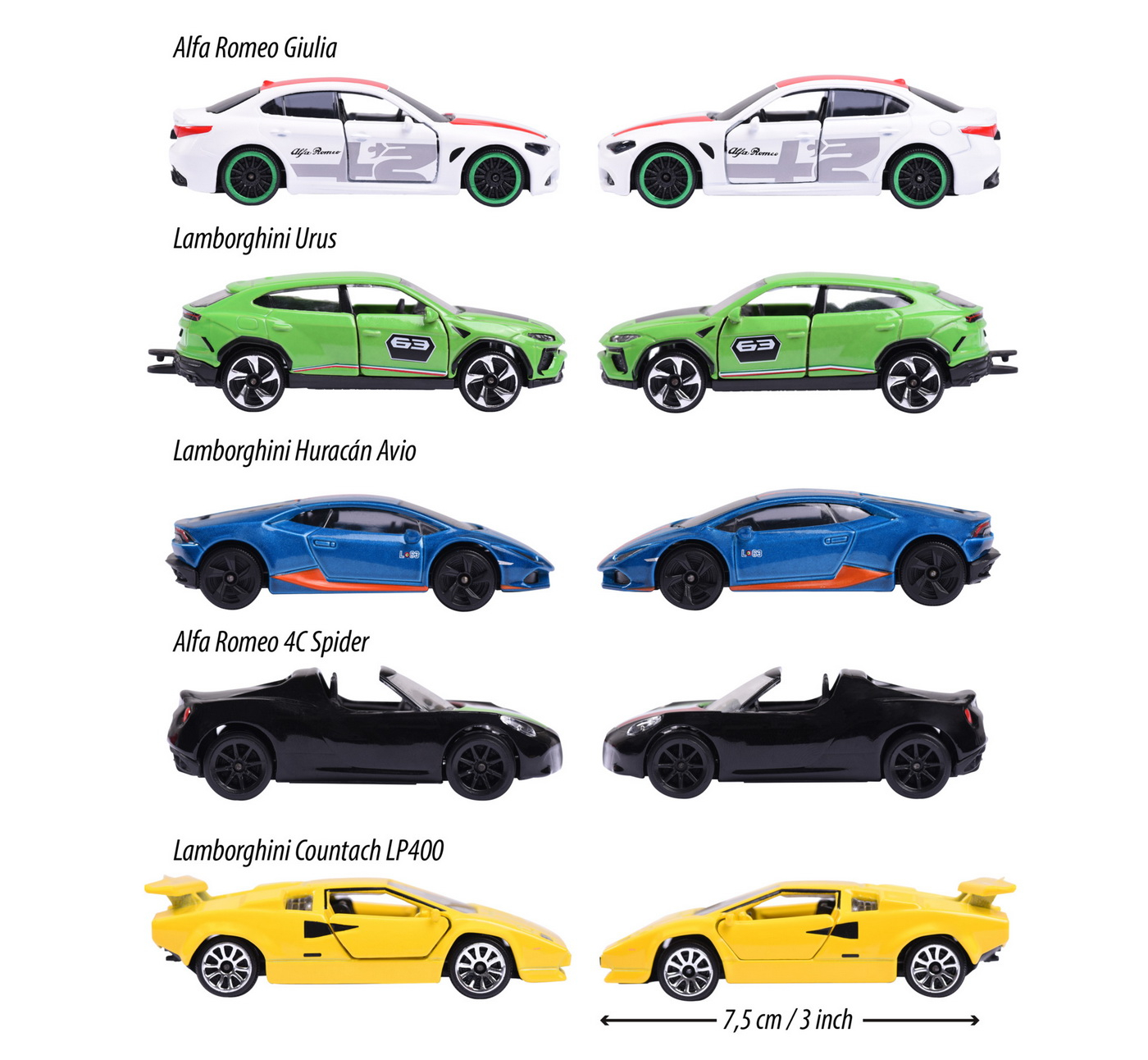 Set 5 masinute din metal Dreams Italy, lungime 7.5 cm. Majorette - Dream Cars Italy - 5 masini italiene de jucarie ca set cadou, modele de masini pentru colectionari sau copii de la 3 ani. Setul cadou Dream Cars Italy, contine cinci masini de vis italiene realiste si de inalta calitate: Alfa Romeo 4C Spider, Lamborghini Countach LP 400, Lamborghini Huracán Avio, Lamborghini Urus si Alfa Romeo Giulia.
