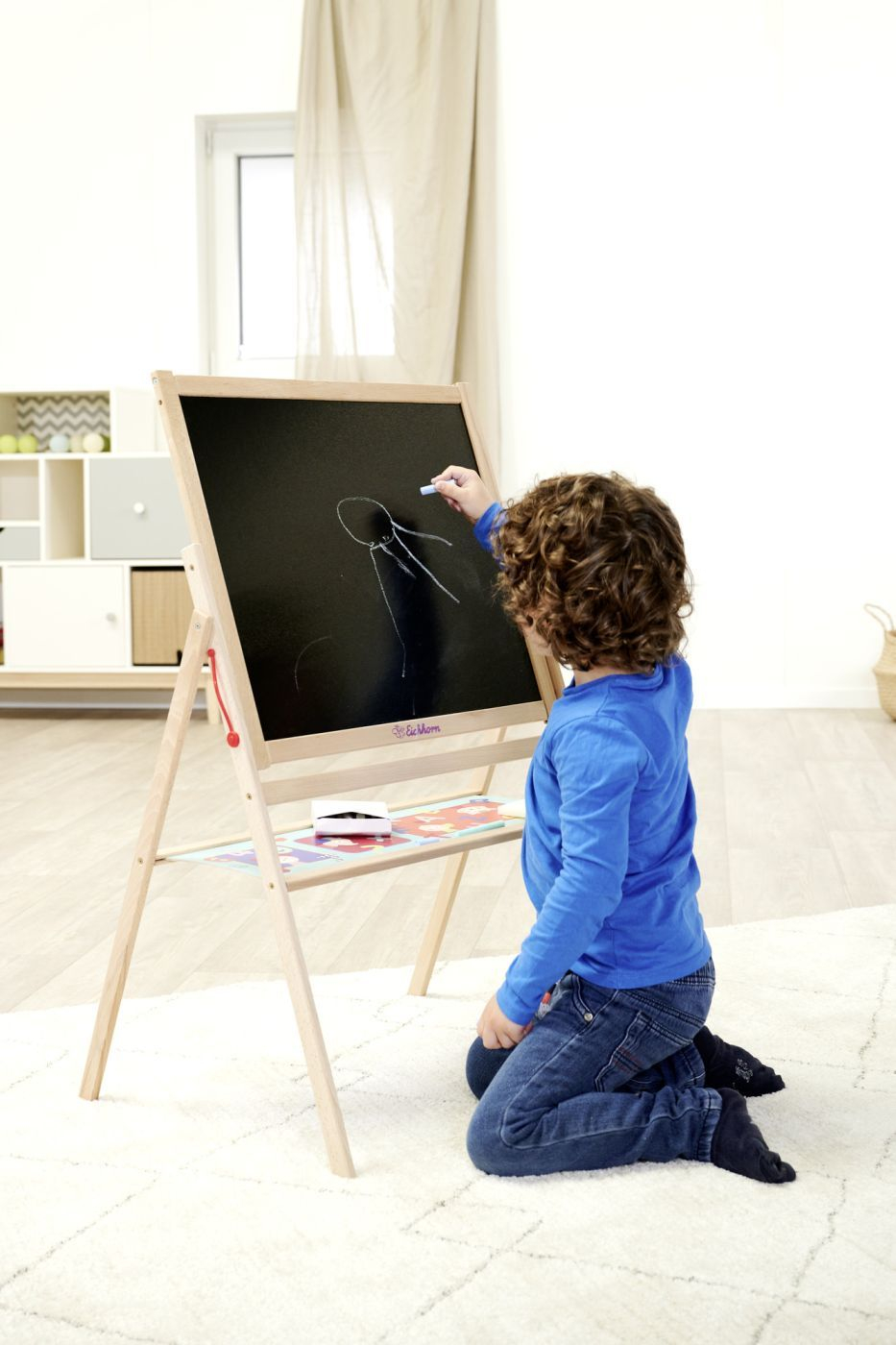 Tabla de desen Eichhorn: Cu tabla de desen cu doua fete de la Eichhorn, imaginatia artistica a celor mici nu are limite. Jocul si pictura promoveaza creativitatea si abilitatile motorii ale copiilor. Tabla de desen este fabricata din lemn de fag de inalta calitate, masoara 58 x 86 cm si include 10 creioane colorate, un pix si un burete. O parte este pentru pix, iar cealalta pentru creioane. Desenele cu creta si pix pot fi spalate, permitand revopsirea sau rescrierea tablei iar si iar. Tava de depozitare este perfecta pentru depozitarea ustensilelor de scris. Potrivita pentru copiii cu varsta de 3 ani si peste.
