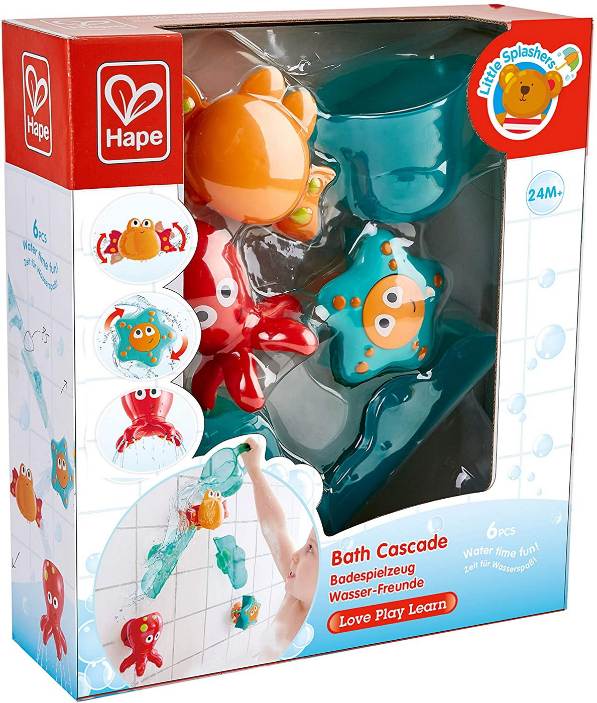 Transformati peretele baii dvs. Intr-o cascada cu acest set intelligent cu ventuze. Apa face ca animalele marine sa danseze si sa se roteasca! Atasati-le de peretele baii folosind ventuzele. Utilizati ulciorul pentru a turna apa pe animale si tobogane cu apa Include doua tobogane, trei personaje in miscare, animale marine si un ulcior Steaua de mare este o roata de apa. Pe masura ce apa se revarsa in ea, se invarte si redistribuie apa dedesubt. Crabul distribuie apa dintr-o parte in alta cu ambele gheare si parand ca danseza. Se toarna apa in caracatita si se revarsa din tentaculele sale Copiii se pot juca individual cu fiecare element sau le pot organiza in diferite configuratii in cascada. Face timpul de baie si mai distractive. invata copiii despre fluxurile de apa, gravitatia si creaturile marine Jucariile sunt realizate din lemn, folosind materiale ecologice, vopsite in culori atragatoare cu vopsele nontoxice, care depasesc cele mai inalte si stricte standarde internationale de siguranta si calitate, precum EN71, ISO9001, ASTM F963 si altele. De multi ani, Hape a creat jucarii fantastice, de inalta calitate, folosind materiale ecologice si durabile, fiecare produs fiind atent proiectat pentru a stimula abilitatile senzoriale, fizice si emotionale.