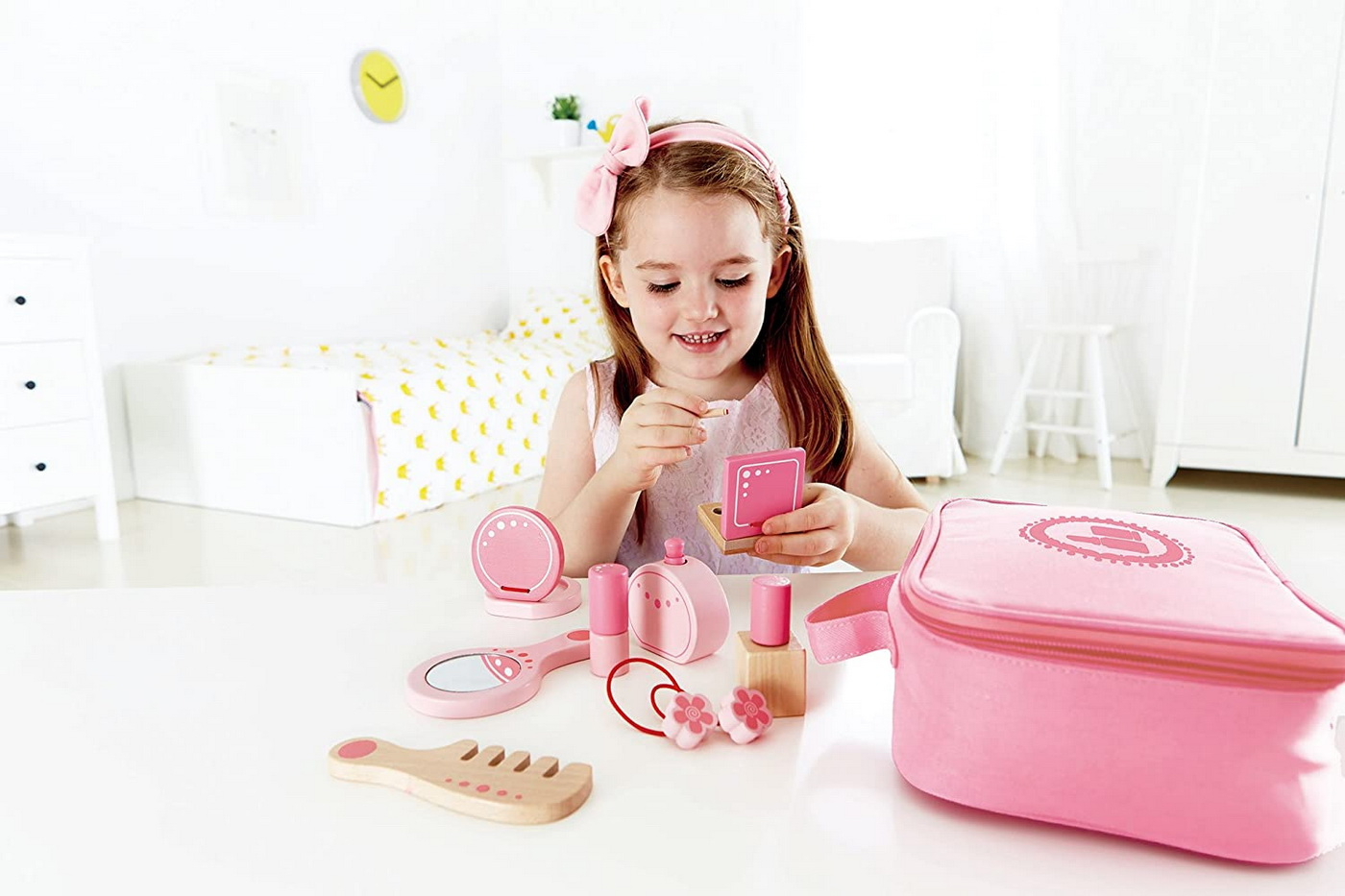incurajati jocul de rol si satisfaceti curiozitatea unui copil cu acest kit cosmetic. Setul include par, unghii si articole esentiale de machiaj. Pregateste-te sa iesi si sa-l faci pe copil sa se prefaca jucandu-se folosind toate elementele de baza pentru un aspect plin de farmec. Jucariile sunt realizate din lemn, folosind materiale ecologice, vopsite in culori atragatoare cu vopsele nontoxice, care depasesc cele mai inalte si stricte standarde internationale de siguranta si calitate, precum EN71, ISO9001, ASTM F963 si altele. De multi ani, Hape a creat jucarii fantastice, de inalta calitate, folosind materiale ecologice si durabile, fiecare produs fiind atent proiectat pentru a stimula abilitatile senzoriale, fizice si emotionale.