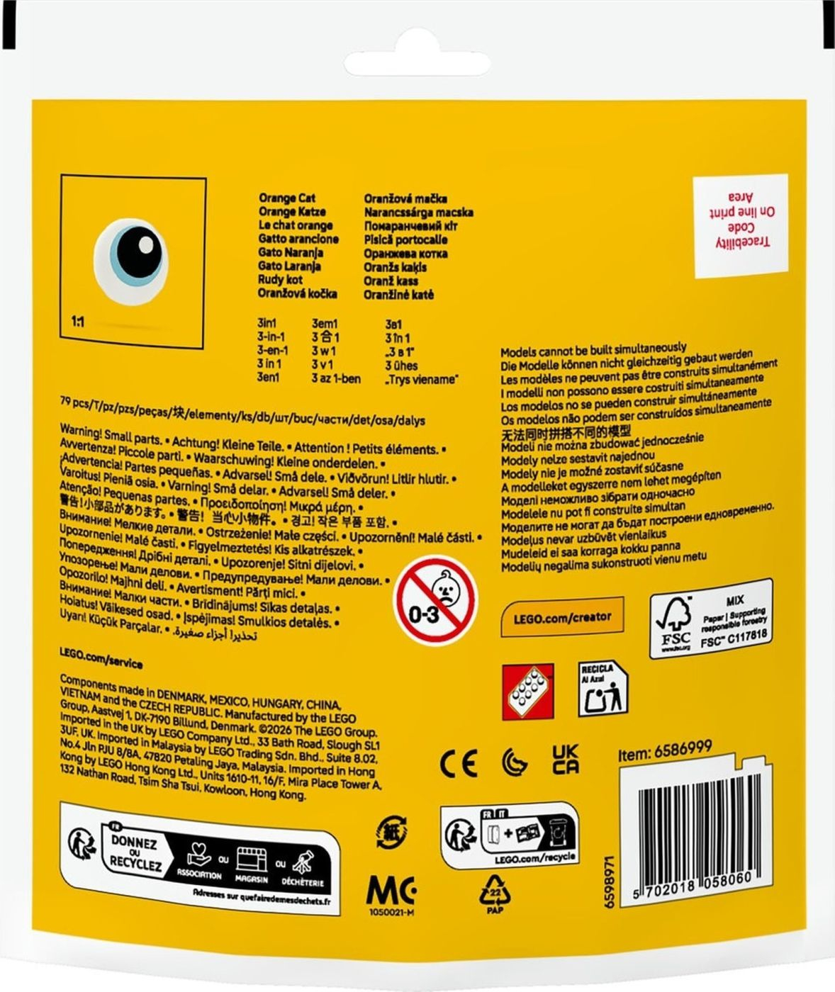 Acest simpatic set LEGO Creator 3 in 1 Pisica portocalie (30714) invita iubitorii de animale, cu varsta de 6 ani si mai mari, sa se bucure de o experienta de constructie creativa si plina de imaginatie. Folosind acelasi set de caramizi, copiii pot construi o pisica adorabila, cu ochi mari si expresivi, alaturi de un bol cu lapte, perfecta pentru joaca si etalare. Joaca continua cu posibilitatea de a reconstrui modelul intr-un crocodil simpatic, insotit de o balta de apa, sau intr-o bufnita draguta, asezata langa un cuib cu doua oua. Fiecare varianta ofera sau noua poveste si stimuleaza creativitatea, incurajeaza copiii sa exploreze diferite animale si scenarii de joaca. Acest set LEGO Creator 3 in 1 este ideal ca mic cadou sau surpriza pentru copiii pasionati de animale si constructii, oferind distractie variata si dezvoltarea imaginatiei. Modelele nu pot fi construite simultan. Setul contine 79 de piese.
