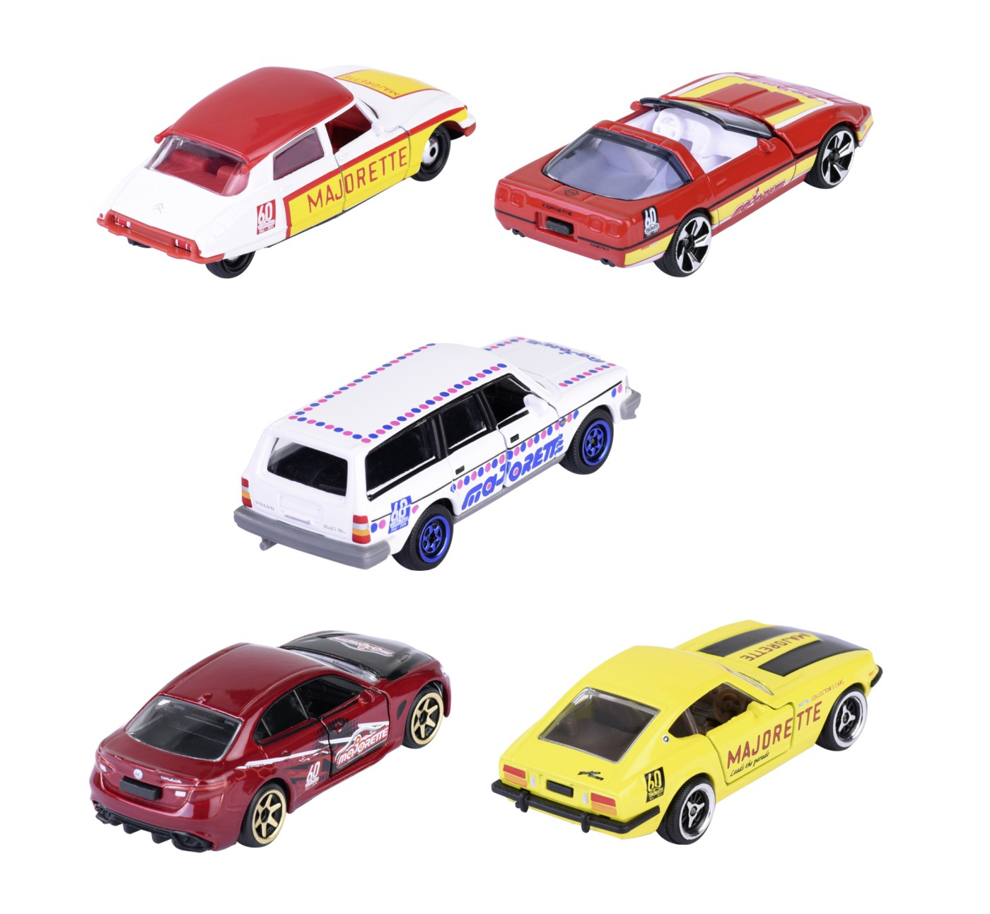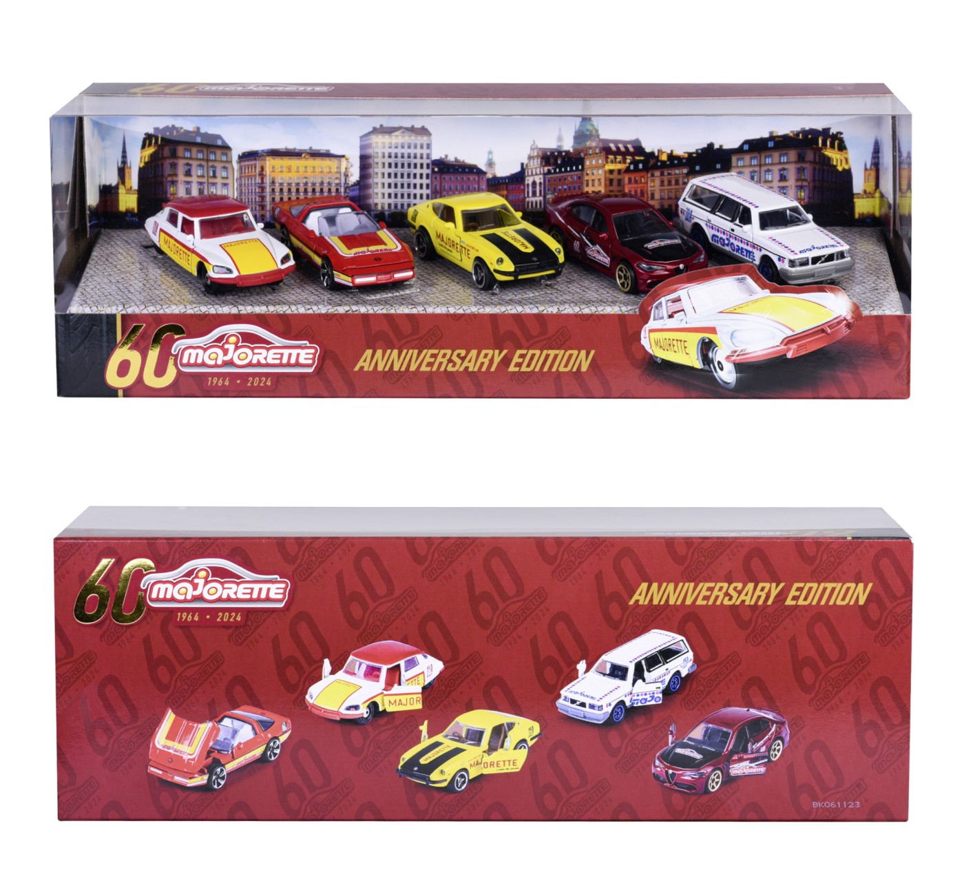 Sarbatoreste cea de-a 60-a aniversare a modelelor de masini Majorette cu 5 masini emblematice din 60 de ani de istorie a automobilelor. Set 5 masini de jucarie: 1. DS 21, 2. Datsun 260 Z, 3. Volvo 240 GL, 4. Chevrolet Corvette 1990 ZR-1, 5. Alfa Romeo Giulia. Datsun 260 Z si DS 21 .