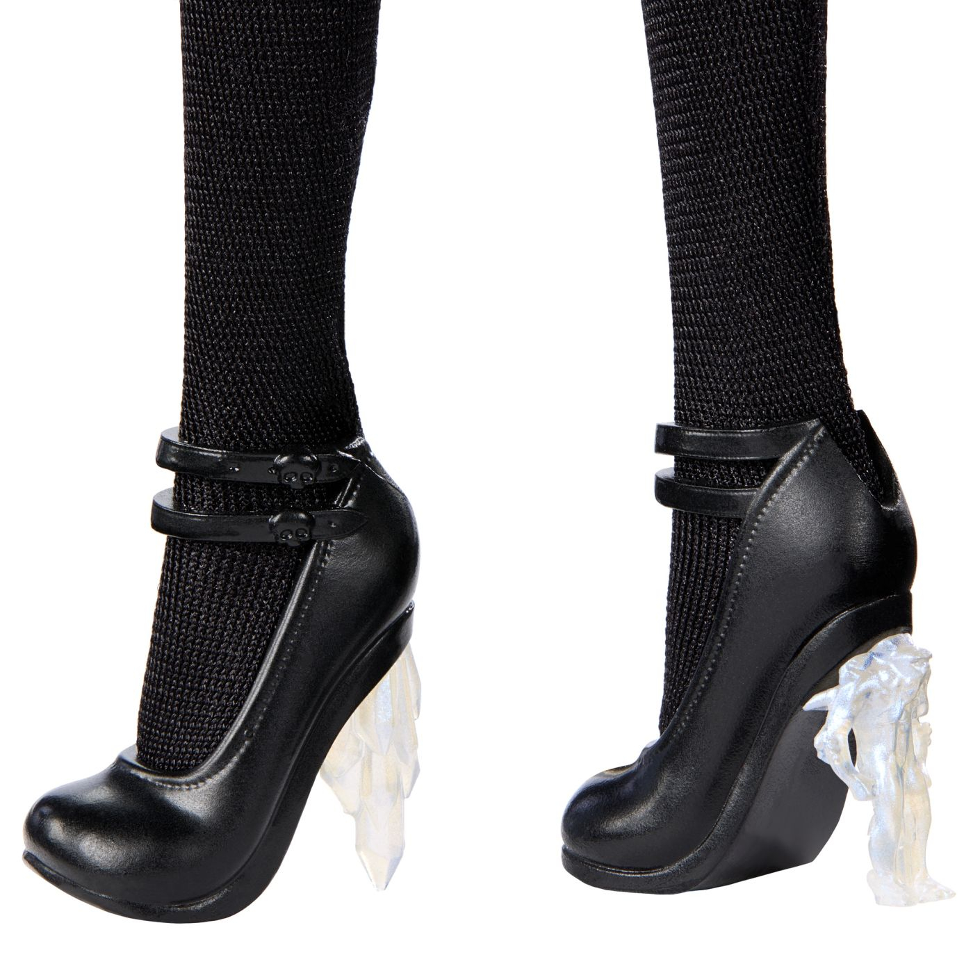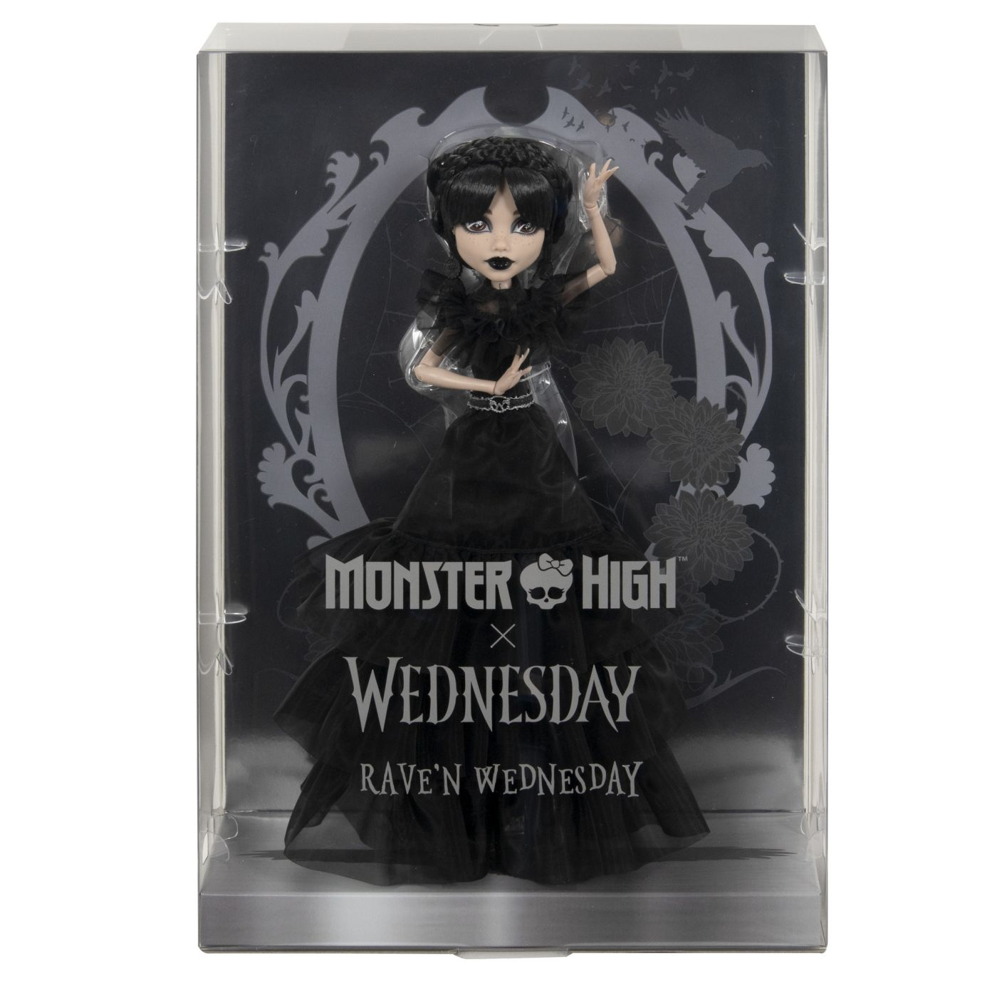Colectia Monster High x Wednesday aduce un omagiu serialului de televiziune cu spirit intunecat si de-a dreptul straniu printr-o linie de papusi de groaza. Inspirata de rochia de epoca a personajului ei din scena de dans scolar a serialului, aceasta papusa Rave'N Wednesday face goth glam intr-o rochie neagra la miezul noptii. Întunecata ca si simtul ei al umorului, rochia din organza a lui Rave'N Wednesday are straturi transparente care par filate din umbre. O curea statement si cercei Monster High completeaza look-ul ei chic. Este pregatita sa paseasca intr-o noapte de cosmar in pantofii ei boo-spoke! Tocurile lor de gheata si yeti aduc un omagiu temei dansului Rave'N: criza climatica intalneste evenimentul extinctiei.