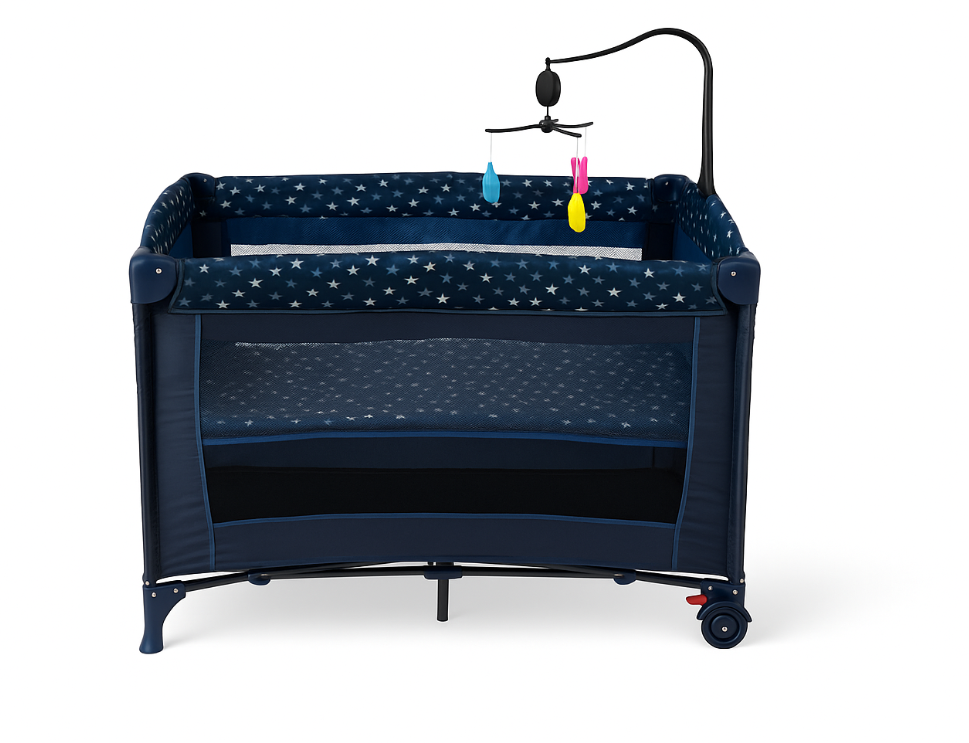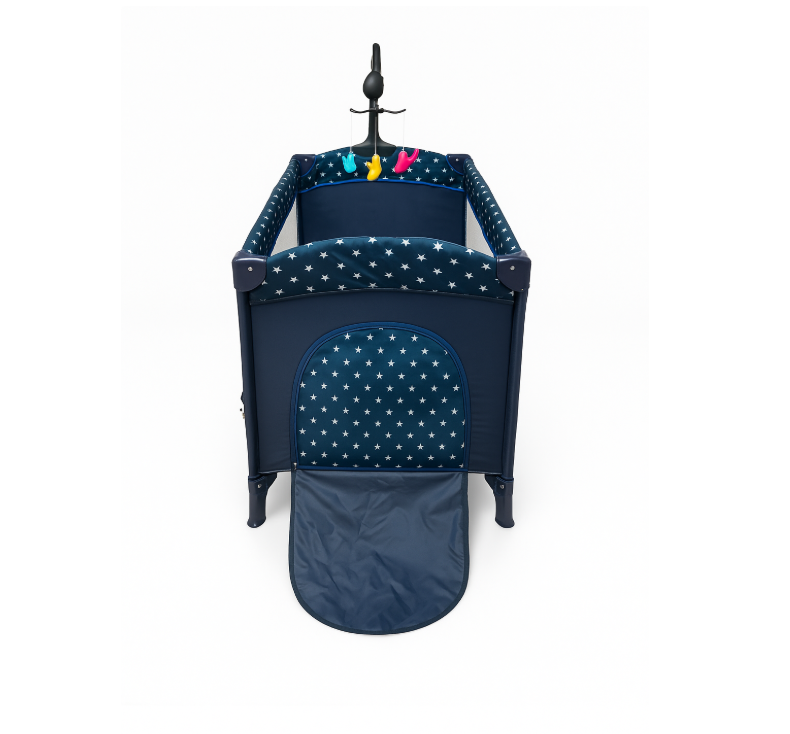 Patut pliabil, cu laterala culisanta, 2 niveluri, masa de infasat, carusel muzical, albastru