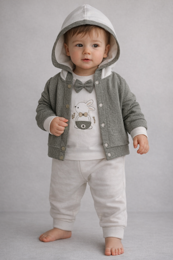 Confort și практичност: Setul include o jachetă călduroasă și moale, un body cu nasturi, ușor de îmbrăcat și dezbrăcat, și pantaloni. Materialul jersey asigură o textură plăcută la atingere și o respirabilitate optimă, menținând bebelușul confortabil pe tot parcursul zilei.