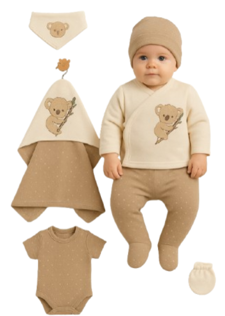 Îmbracă-ți micuțul cu dragoste și grijă folosind setul nostru complet pentru bebeluși, creat special pentru a-i oferi un start minunat în viață. Fabricat cu materiale de cea mai bună calitate și cu un design adorabil, acest set este alegerea ideală pentru părinții care își doresc tot ce este mai bun pentru bebelușul lor.