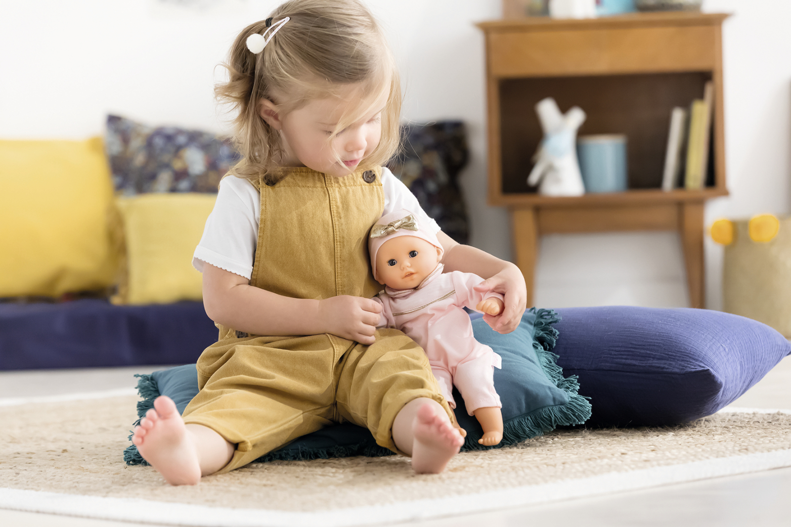 Bébé Calin Manon este o papusa de 30 cm, cu corpul moale,articulat ca al unui bebelus adevarat, iar ochii sai albastri adormiti se inchid atunci cand este pus jos pentru un pui de somn. Fata, bratele si picioarele papusii sunt realizate din vinil moale la atingere, care este delicat parfumat cu vanilie.