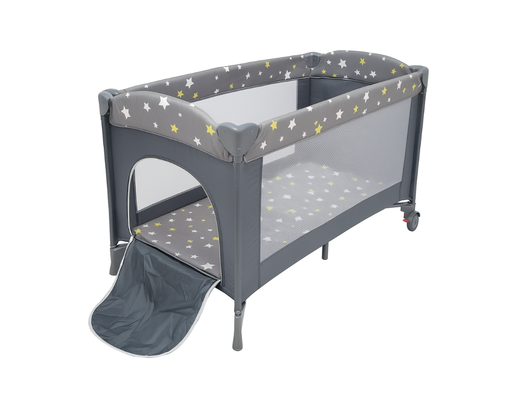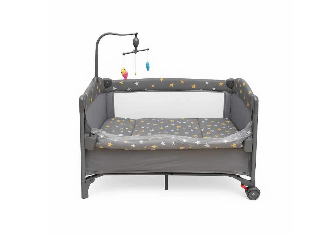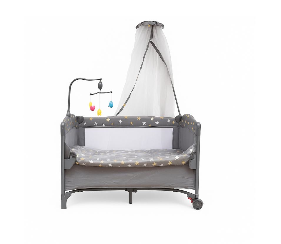 Patut pliabil, cu laterala culisanta, 2 niveluri, masa de infasat, carusel muzical, gri