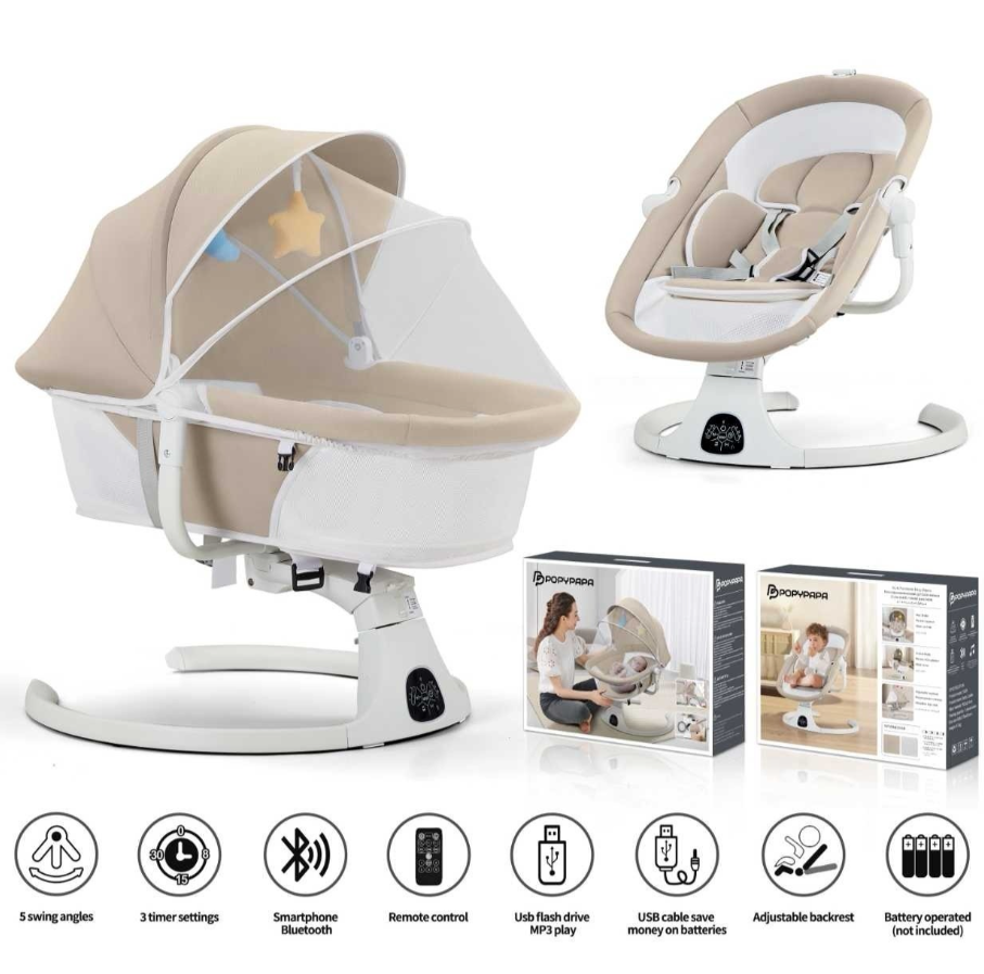 Leagan Electric, Balansoar si patut pentru bebelusi , 3 Trepte Balans, Muzical, Conexiune Bluetooth, Telecomanda, Jucarii de Plus, Cu Acoperis Rabatabil si Plasa insecte, Bej