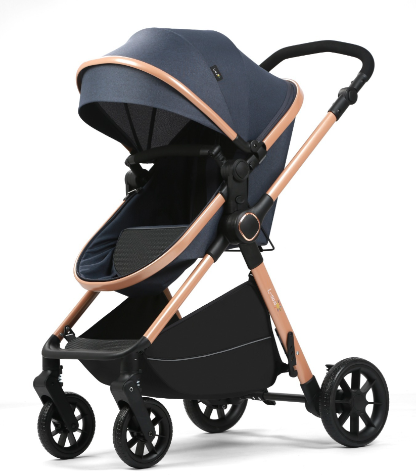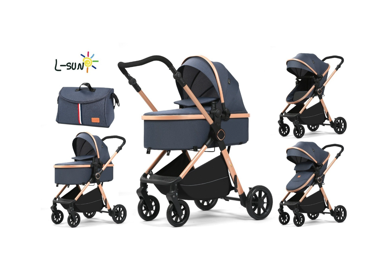 Carucior, 3 in 1, cu suspensii duble si landou reversibil, Element sustinere dublu, L-Sun, Albastru