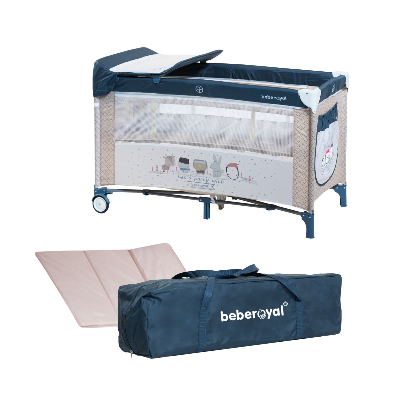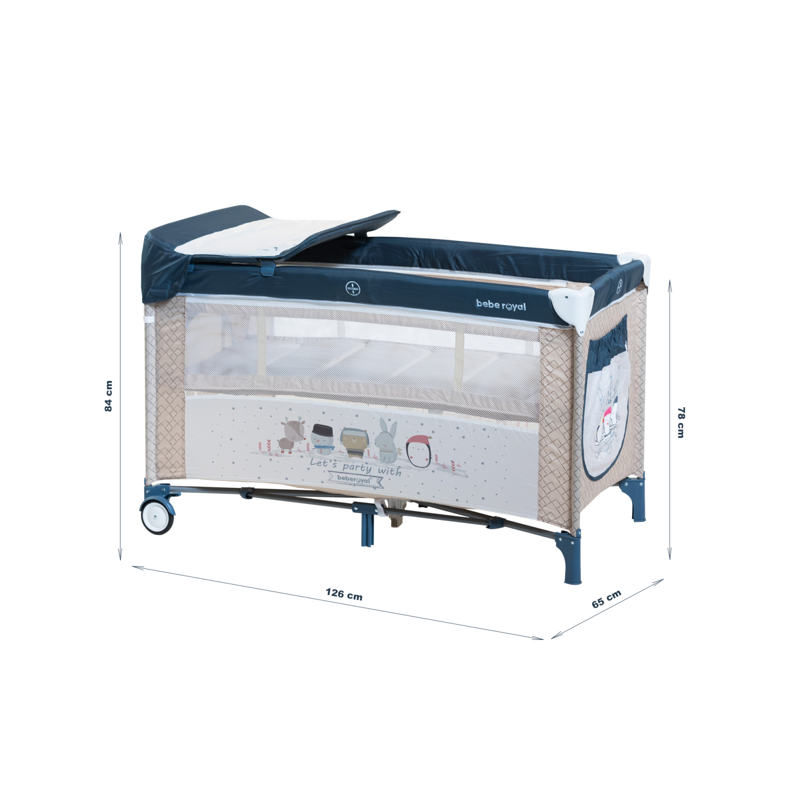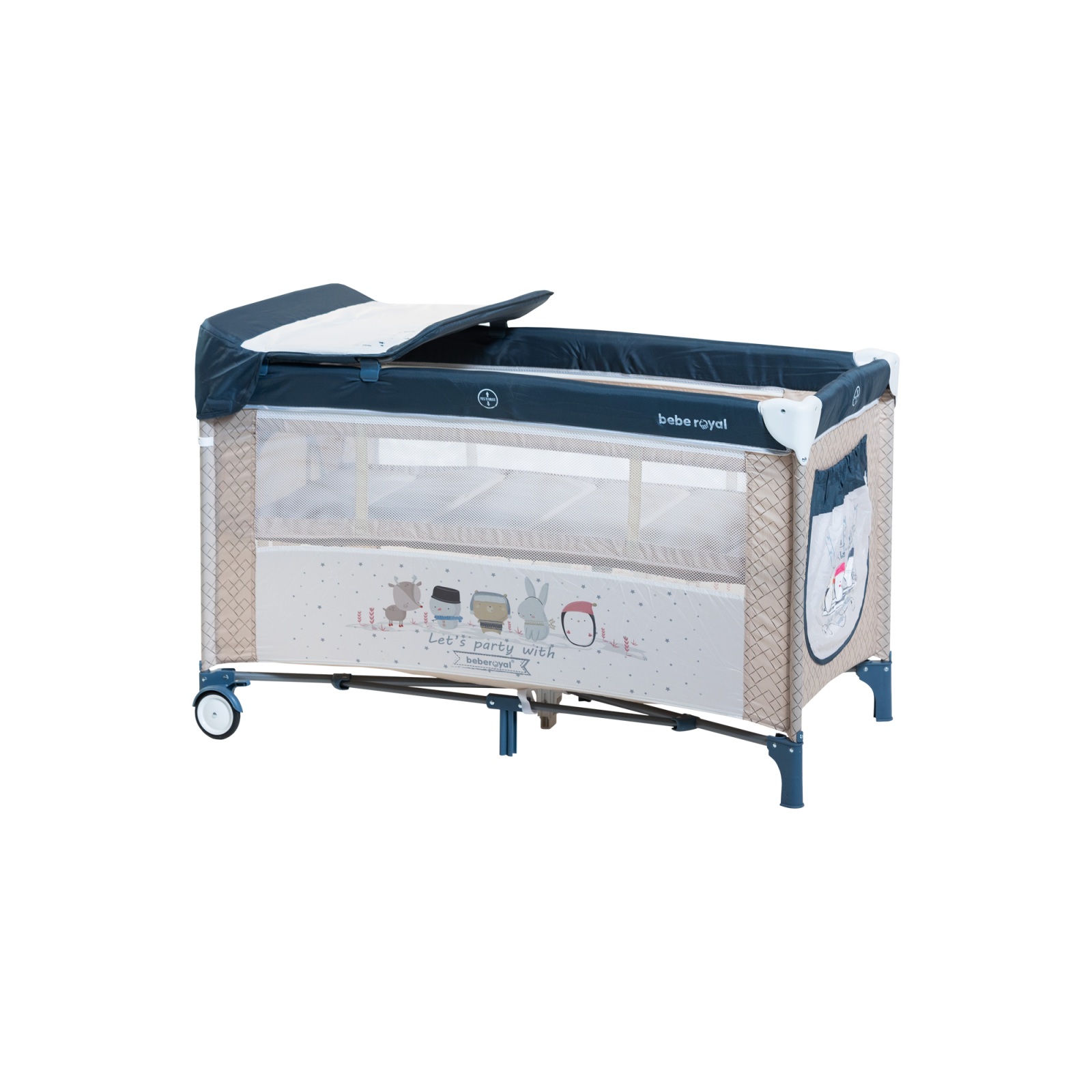 Let’s party with Bebe Royal este un patut de copii pliabil, multifunctional, care poate fi folosit atat acasa cat si in calatorii, poate fi folosit si ca un tarc de joaca atat in interior cat si in timpul relaxarii in aer liber. Designul vesel si prietenos, securitatea eficienta, precum functia de depozitare datorata compartimentului lateral, vor face Let’s party with Bebe Royal sa atraga atat parintii, cat si copii.
