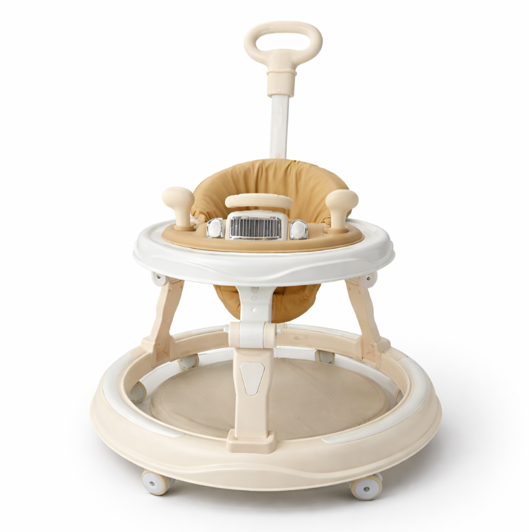 Scaunul moale, bine conturat, oferă confort sporit și susținere corectă, iar tava frontală cu elemente interactive stimulează curiozitatea și dezvoltarea coordonării copilului. Roțile pivotante permit deplasarea lină în orice direcție, iar mânerul de împingere pentru părinte adaugă un plus de control și siguranță.