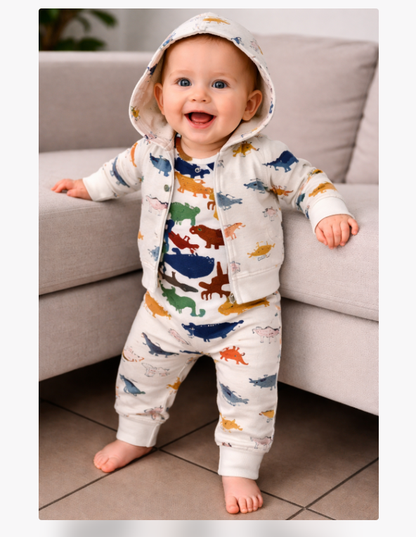 Compleu 3 piese, cu gluga, Dinozauri colorati, 6-9 luni