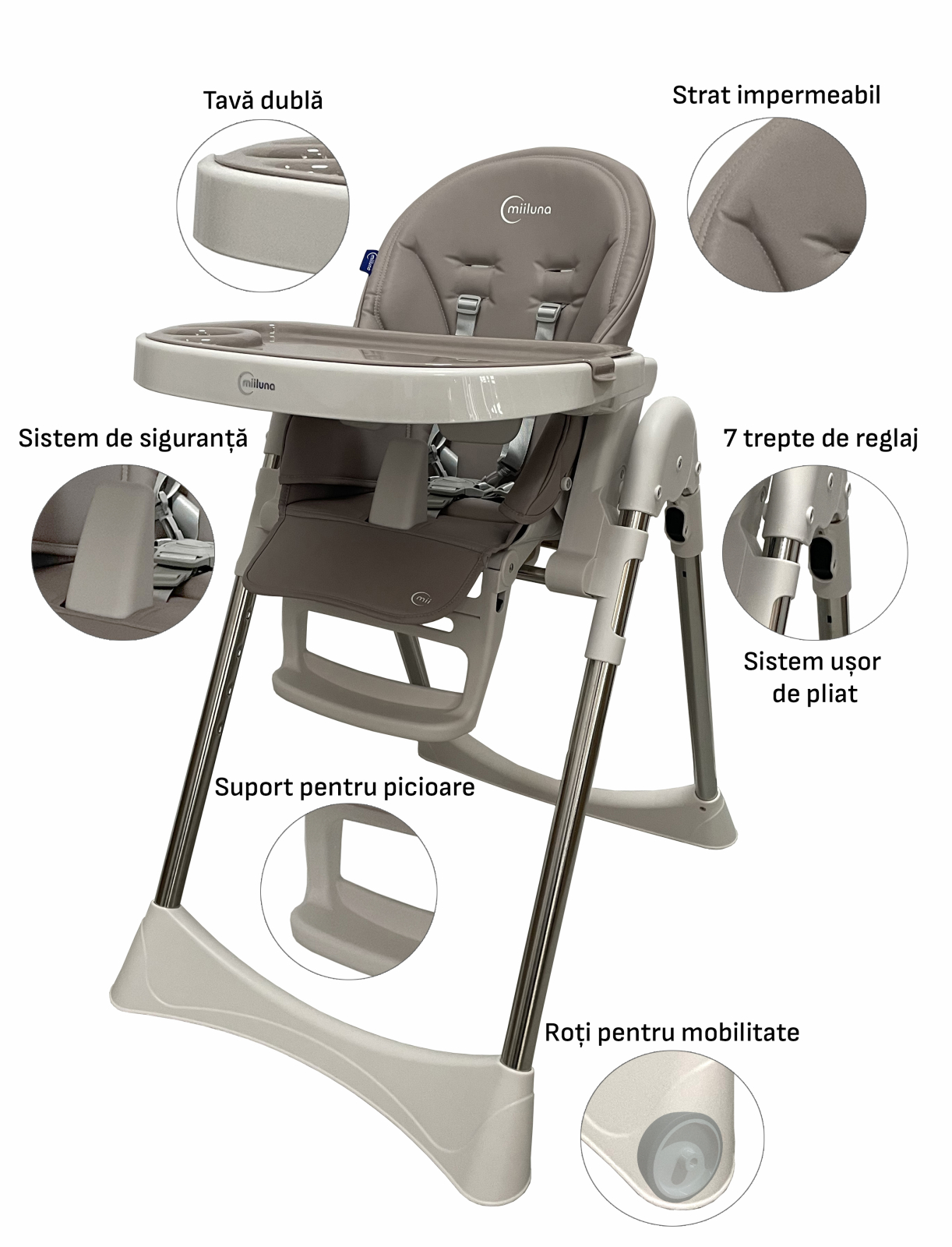 Miiluna Andromeda Grey – locul sigur si confortabil unde fiecare moment devine special Imaginati-va cum micutul vostru zambeste in timp ce il asezati in scaun – relaxat, confortabil, protejat. Miiluna Andromeda Grey nu este doar un scaun de masa, ci locul unde primele gusturi, primele rasete si primele descoperiri devin memorii de neuitat. Spatar reglabil pana la 145° Fie ca micutul vrea sa stea drept la masa sau sa se relaxeze dupa o gustare, spatarul reglabil ii ofera sustinere perfecta. Este ca un mic brat care il tine confortabil, protejat si fericit, fie ca se joaca sau doarme o clipa. Suport de picioare ajustabil in 3 pozitii Copiii cresc rapid, iar Miiluna Andromeda Grey creste impreuna cu el. Suportul de picioare il ajuta sa stea corect si relaxat, sprijinindu-i micile membre intr-un mod natural si ergonomic. Reglare inaltime pe 7 pozitii Indiferent daca este un mic explorator sau abia incepe sa invete sa stea la masa, scaunul se ajusteaza usor pentru a fi la inaltimea perfecta. Tu vei avea tot timpul acces la el fara sa te apleci prea mult, iar el se simte implicat si in siguranta. Husa din PU ecologic, usor de curatat Zambete, gusturi noi, pete… toate fac parte din copilarie! Dar curatarea nu trebuie sa fie o povara. Materialul ecologic al husei se curata rapid si usor, pastrand scaunul proaspat si igienic pentru fiecare moment petrecut impreuna. Masa principala si tavita secundara Fiecare masa sau moment de joaca poate fi adaptat instant. Tavita secundara se inlocuieste rapid, astfel incat sa treci usor de la hranire la joc. Asa, copilul tau exploreaza, gusta si invata fara intreruperi, iar tu te bucuri de fiecare zambet. Rotite pentru transport facil Vrei sa muti scaunul din bucatarie in living sau in camera de joaca? Cu rotitele integrate, mutarea este rapida si fara efort, iar copilul ramane mereu in centrul atentiei tale. Pliabil si usor de depozitat Cand spatiul e limitat, fiecare centimetru conteaza. Miiluna Andromeda Grey se pliaza simplu si ocupa foarte putin loc, astfel incat sa ai mai mult spatiu pentru joaca, pentru tine sau pentru momentele in care vrei sa pastrezi ordinea. Culori moderne si elegante Pe langa functionalitate, scaunul aduce un strop de stil in casa ta. Culorile sale moderne se potrivesc armonios in orice interior, integrandu-se natural si aducand o nota de prospetime si veselie. Stabilitate si siguranta Cu sistemul de amortizare profesionist si centura de siguranta in 5 puncte, copilul tau este protejat in orice moment imprevizibil. Tu te bucuri linistita, iar el se simte liber sa exploreze, sa invete si sa rada. Caracteristici tehnice complete: Spatar reglabil pana la 145° Suport de picioare reglabil in 3 pozitii Reglare inaltime pe 7 pozitii Husa din PU ecologic, usor de curatat Masa principala si tavita secundara, cu inlocuire rapida Rotite pentru transport facil Pliabil si usor de depozitat Centura de siguranta in 5 puncte Sistem profesionist de amortizare pentru stabilitate Culori moderne si elegante, adaptabile oricarui interior Versatil: se poate folosi ca scaun de masa, fotoliu, scaun de joaca sau masa de activitati Dimensiuni: Depliat: 82 cm (L) x 57cm (A) x 105 cm (I) Ambalat: 82 cm (L) x 57cm (A) x 105 cm (I)