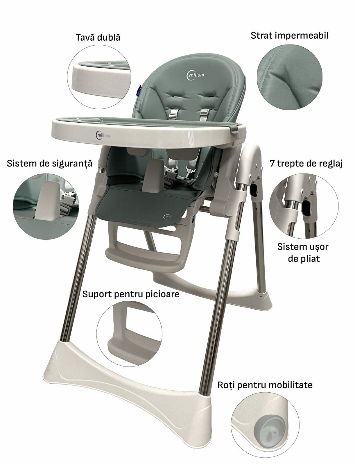 Miiluna Andromeda Taupe – locul sigur si confortabil unde fiecare moment devine special Imaginati-va cum micutul vostru zambeste in timp ce il asezati in scaun – relaxat, confortabil, protejat. Miiluna Andromeda Taupe nu este doar un scaun de masa, ci locul unde primele gusturi, primele rasete si primele descoperiri devin memorii de neuitat. Spatar reglabil pana la 145° Fie ca micutul vrea sa stea drept la masa sau sa se relaxeze dupa o gustare, spatarul reglabil ii ofera sustinere perfecta. Este ca un mic brat care il tine confortabil, protejat si fericit, fie ca se joaca sau doarme o clipa. Suport de picioare ajustabil in 3 pozitii Copiii cresc rapid, iar Miiluna Andromeda Taupe creste impreuna cu el. Suportul de picioare il ajuta sa stea corect si relaxat, sprijinindu-i micile membre intr-un mod natural si ergonomic. Reglare inaltime pe 7 pozitii Indiferent daca este un mic explorator sau abia incepe sa invete sa stea la masa, scaunul se ajusteaza usor pentru a fi la inaltimea perfecta. Tu vei avea tot timpul acces la el fara sa te apleci prea mult, iar el se simte implicat si in siguranta. Husa din PU ecologic, usor de curatat Zambete, gusturi noi, pete… toate fac parte din copilarie! Dar curatarea nu trebuie sa fie o povara. Materialul ecologic al husei se curata rapid si usor, pastrand scaunul proaspat si igienic pentru fiecare moment petrecut impreuna. Masa principala si tavita secundara Fiecare masa sau moment de joaca poate fi adaptat instant. Tavita secundara se inlocuieste rapid, astfel incat sa treci usor de la hranire la joc. Asa, copilul tau exploreaza, gusta si invata fara intreruperi, iar tu te bucuri de fiecare zambet. Rotite pentru transport facil Vrei sa muti scaunul din bucatarie in living sau in camera de joaca? Cu rotitele integrate, mutarea este rapida si fara efort, iar copilul ramane mereu in centrul atentiei tale. Pliabil si usor de depozitat Cand spatiul e limitat, fiecare centimetru conteaza. Miiluna Andromeda Taupe se pliaza simplu si ocupa foarte putin loc, astfel incat sa ai mai mult spatiu pentru joaca, pentru tine sau pentru momentele in care vrei sa pastrezi ordinea. Culori moderne si elegante Pe langa functionalitate, scaunul aduce un strop de stil in casa ta. Culorile sale moderne se potrivesc armonios in orice interior, integrandu-se natural si aducand o nota de prospetime si veselie. Stabilitate si siguranta Cu sistemul de amortizare profesionist si centura de siguranta in 5 puncte, copilul tau este protejat in orice moment imprevizibil. Tu te bucuri linistita, iar el se simte liber sa exploreze, sa invete si sa rada. Caracteristici tehnice complete: Spatar reglabil pana la 145° Suport de picioare reglabil in 3 pozitii Reglare inaltime pe 7 pozitii Husa din PU ecologic, usor de curatat Masa principala si tavita secundara, cu inlocuire rapida Rotite pentru transport facil Pliabil si usor de depozitat Centura de siguranta in 5 puncte Sistem profesionist de amortizare pentru stabilitate Culori moderne si elegante, adaptabile oricarui interior Versatil: se poate folosi ca scaun de masa, fotoliu, scaun de joaca sau masa de activitati Dimensiuni: Depliat: 82 cm (L) x 57cm (A) x 105 cm (I) Ambalat: 82 cm (L) x 57cm (A) x 105 cm (I)