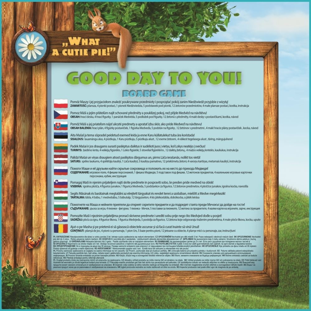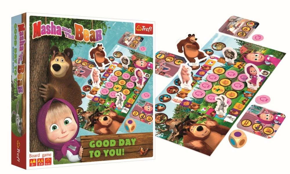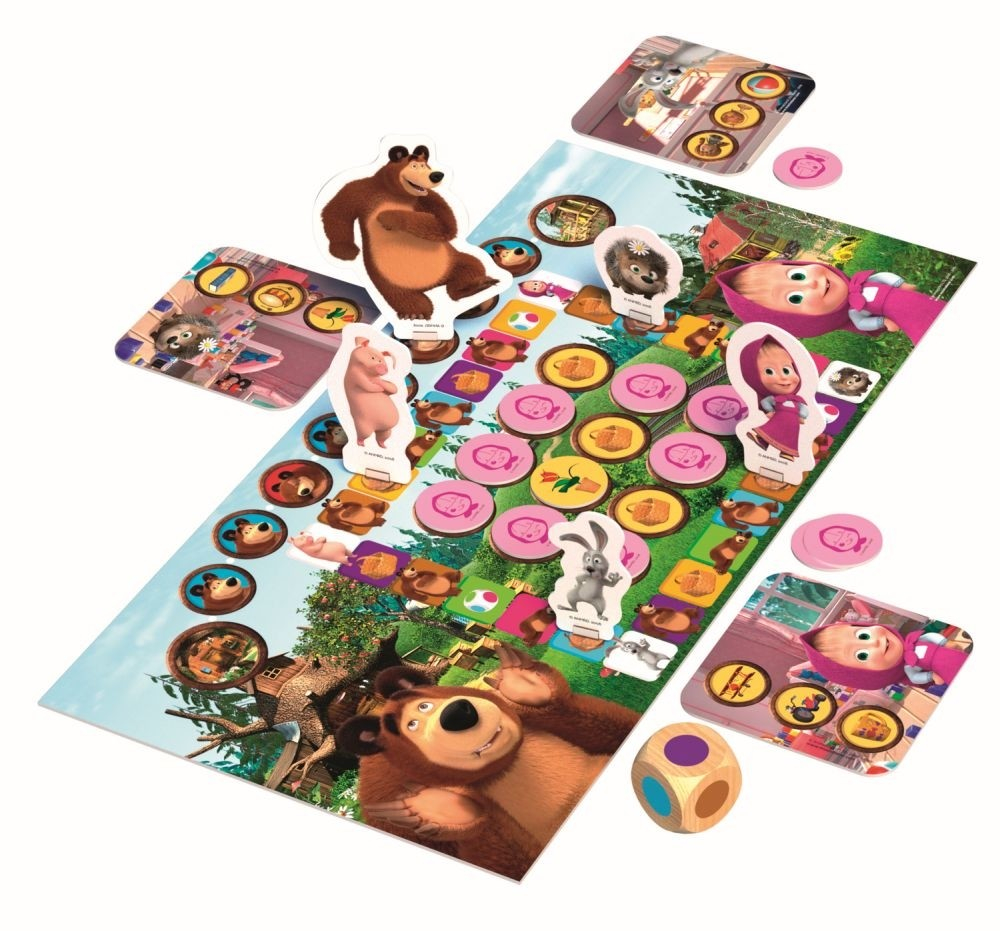 Ursul merge sa viziteze casa lui Masha. În timp ce il astepta, fata a facut mizerie si a ascuns diverse obiecte. Se juca atat de bine incat a uitat ce obiecte a ascuns! Ajut-o pe Masha si pe prietenii ei sa gaseasca comorile ascunse si sa le puna la loc inainte de vizita Ursului! În acest joc nu te joci impotriva adversarilor, ci trebuie sa rezolvati sarcinile impreuna pana la momentul stabilit. CONtINUT: plansa de joc, 4 pioni cu personaje, 1 pion Urs, 5 baze pentru pioni, 12 jetoane cu obiecte, 4 planse mici cu personaje, zar, instructiuni