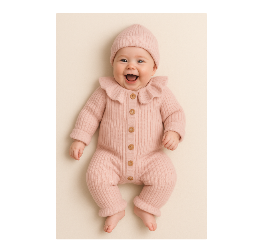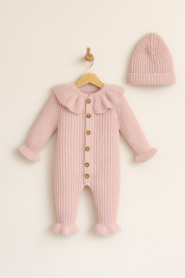 Este un combinezon tricotat pentru bebeluși, culoare roz pudrat, cu: