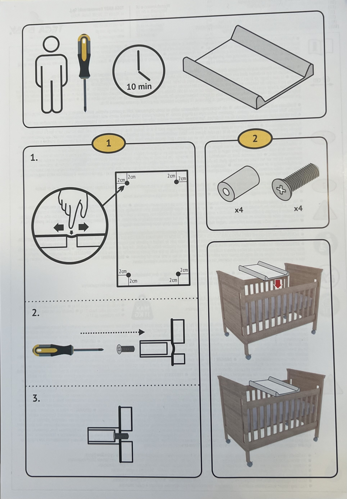Daca masuta de infasat este utilizata ca mobilier pentru patutul copilului, trebuie asezate piciorusele de dedesupt pentru a preveni alunecarea acesteia pe cadrul patutului. Soclurile in care intra piciorusele se regasesc sub masuta, la baza acesteia. Acestea nu sunt vizibile, fiind acoperite cu folie alba, pentru a le depista deplasati-va varful degetelor pe folie. Locatia acestora este reprezentata in schema. In locul soclurilor introduceti suruburile si strangeti-le cu piulite de siguranta.