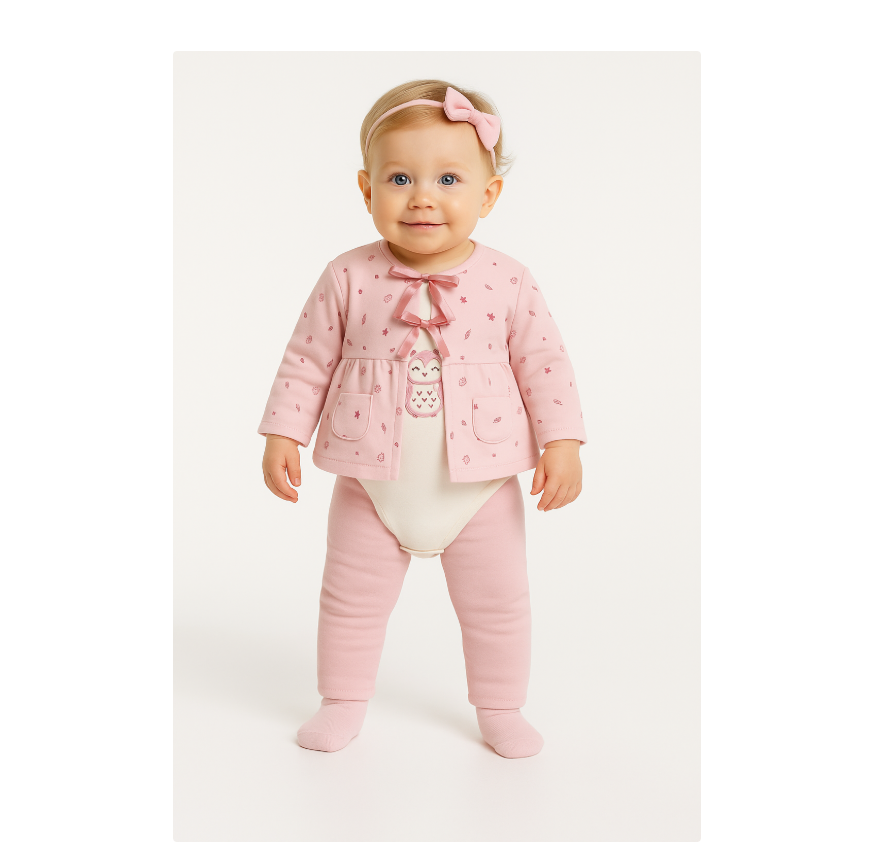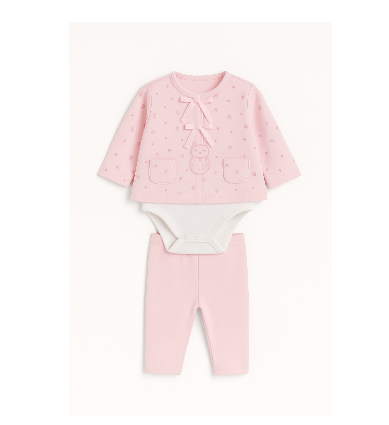 Setul este realizat din bumbac si contine hanoracul, pantalonasii si un body asortat