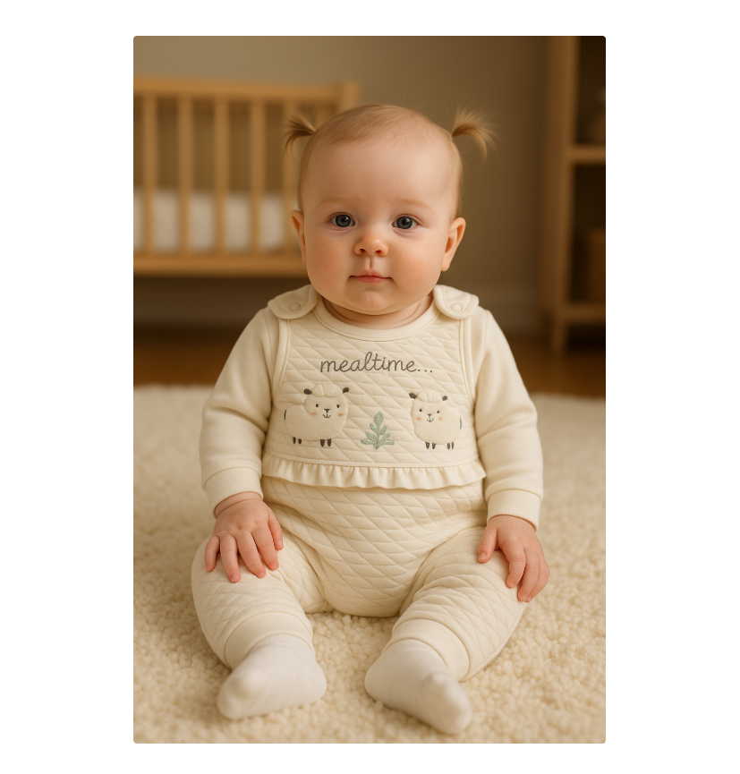 Salopeta prezintă un design încântător cu o oiță drăguță brodată, adăugând un plus de farmec ținutei. Body-ul se închide cu nasturi practici, facilitând schimbarea rapidă a bebelușului.