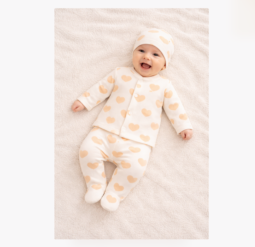 Realizat din bumbac pieptanat, setul contine pantaloni, bluzita si caciulita.