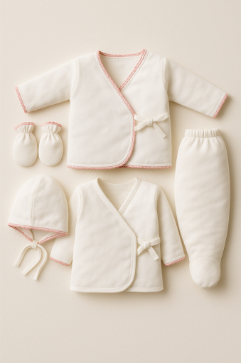 Setul include tot ce are nevoie bebelușul tău în primele luni: maiou de sub, maiou, pantaloni, mănuși și beretă asortată.