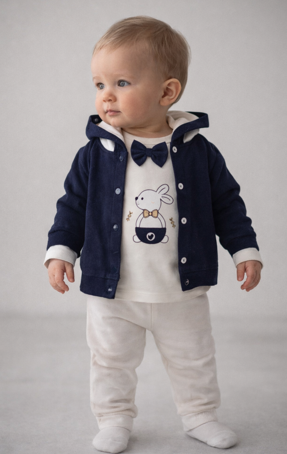 Confort și практичност: Setul include o jachetă călduroasă și moale, un body cu nasturi, ușor de îmbrăcat și dezbrăcat, și pantaloni. Materialul jersey asigură o textură plăcută la atingere și o respirabilitate optimă, menținând bebelușul confortabil pe tot parcursul zilei.
