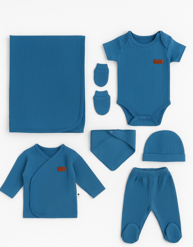 Perfect pentru primele luni, pentru scos din maternitate si pentru uzul zilnic, setul este compus din paturica, manusele, pantalonasi cu botos, bluzita, barbita, body si caciulita.