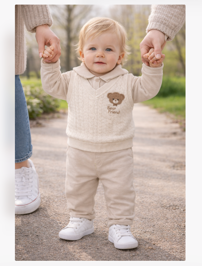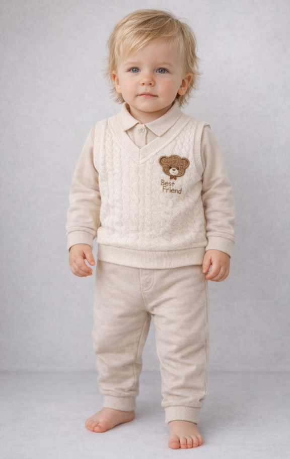• Vestă: O vestă călduroasă și stilată, perfectă pentru a menține bebelușul confortabil în zilele mai răcoroase.